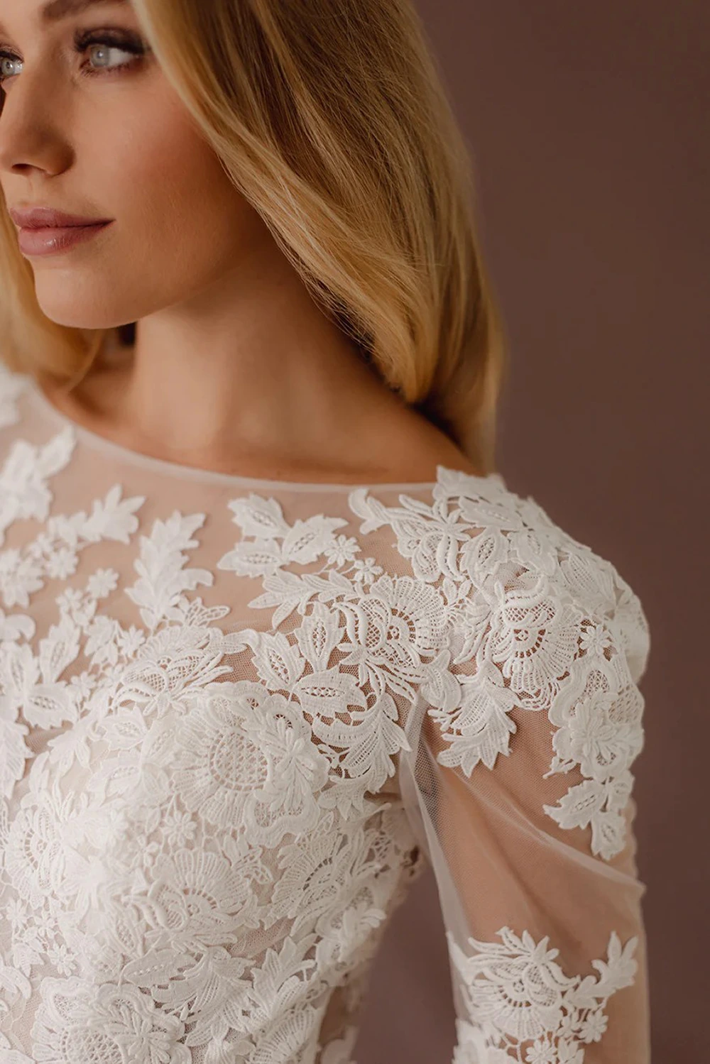 Das Modell Sonata von Abella by Allure Bridals ist ein leichtes Chiffon Brautkleid mit einem langärmligen Oberteil aus floraler Spitze.