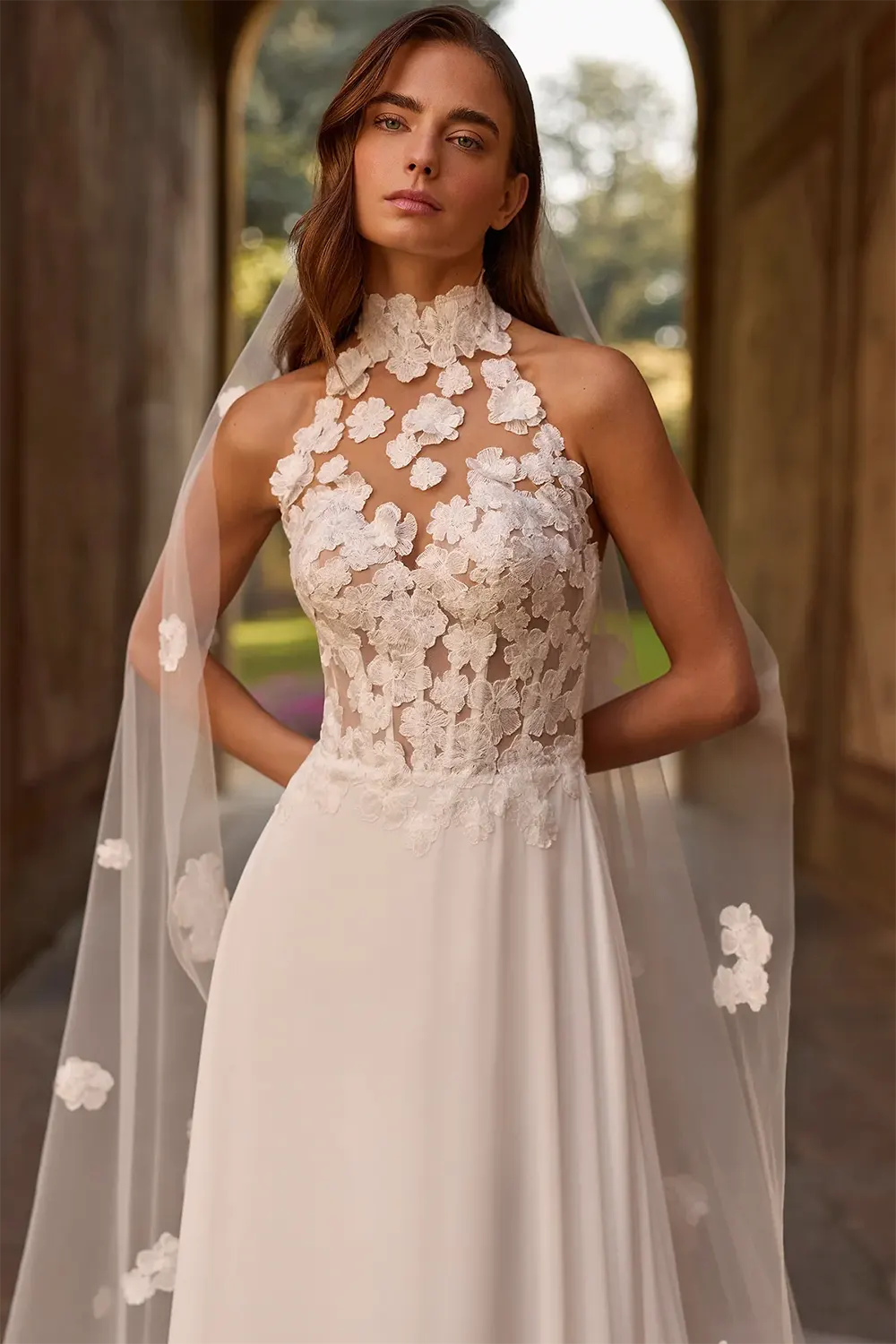 Das Modell Sabrina von Alberto Palatchi ist ein klassisches A-Linien Brautkleid mit zartem Neckholder-Mieder.