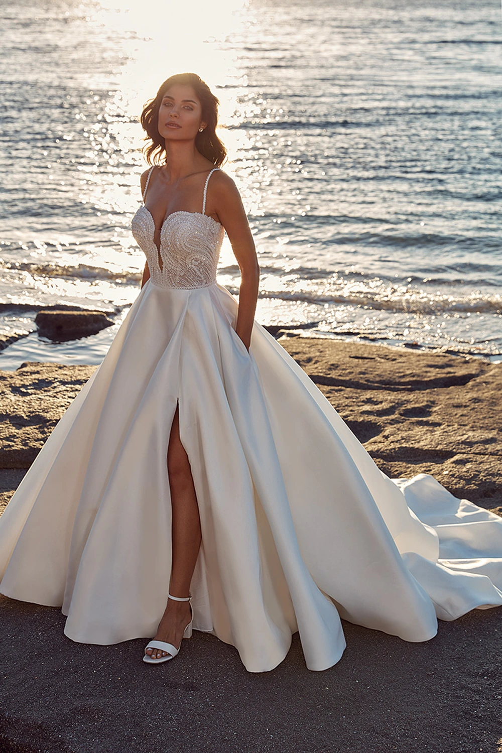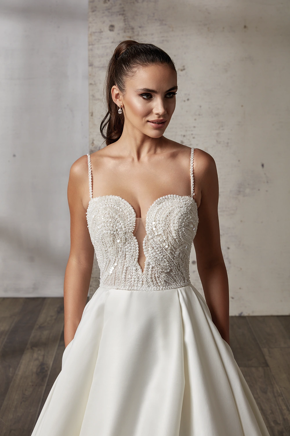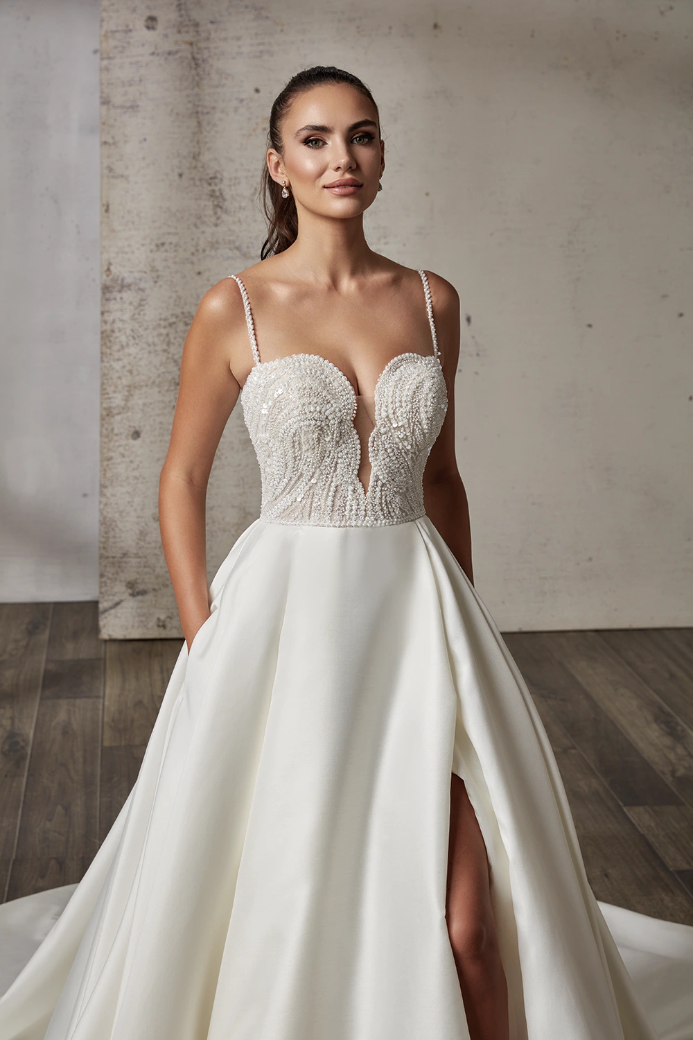 Das Modell Kiana von Eddy K ist ein cleanes A-Linien Brautkleid mit einem funkelndem Oberteil.