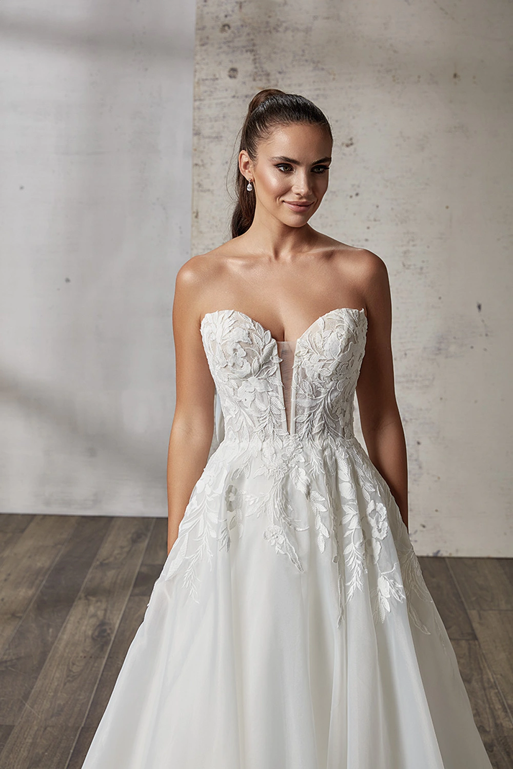 Das Modell Primavera von Eddy K ist ein romantisches A-Linien Kleid mit einer Corsage aus floraler Spitze und einem ausgestelltem Rock aus Organza.