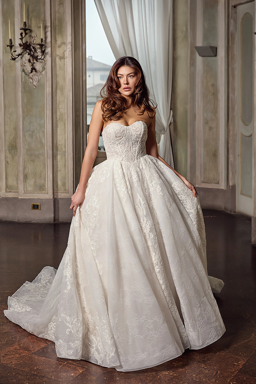 Das Modell Toulouse von Eddy K ist ein Prinzessinnen Brautkleid mit Spitzenapplikationen und leichtem Glitzer.