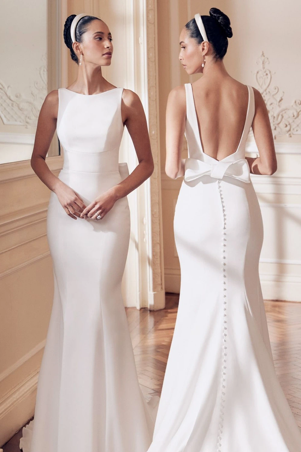 Das Modell Gwen von Ellis Bridals ist ein modernes Fit und Flare Kleid mit einem hohen Ausschnitt, der die Silhouette verlängert, gepaart mit breiten Doppelhüftnähten, die sich unter der Brust für eine schmeichelhafte Definition klemmen.