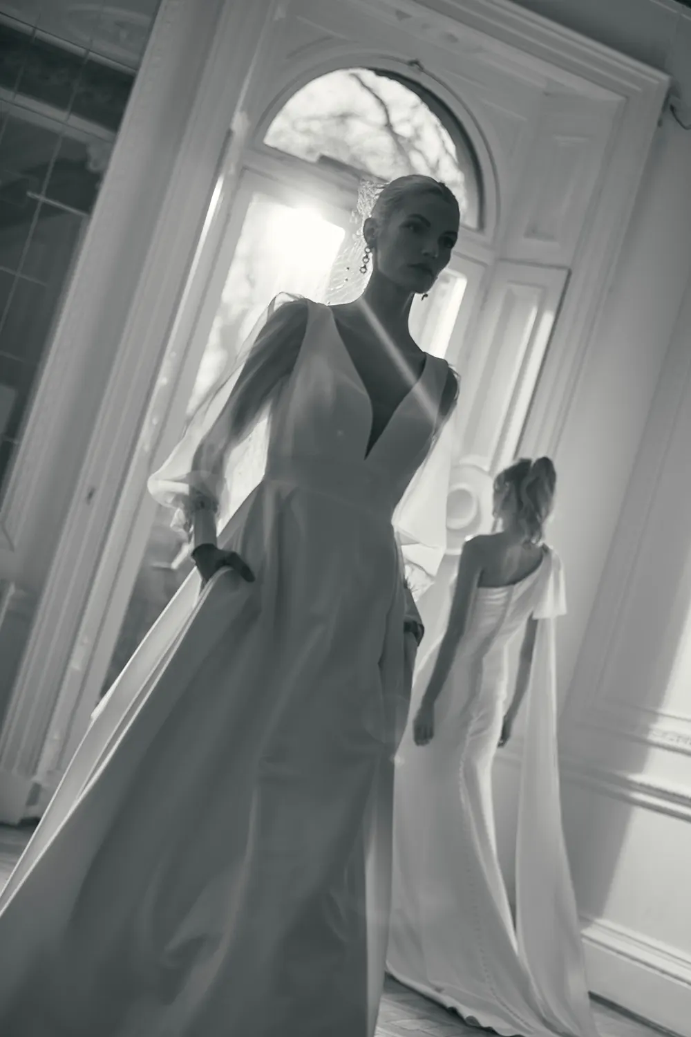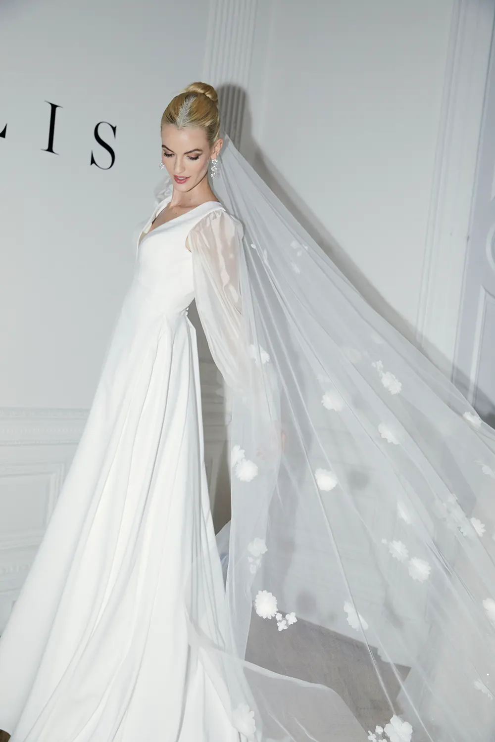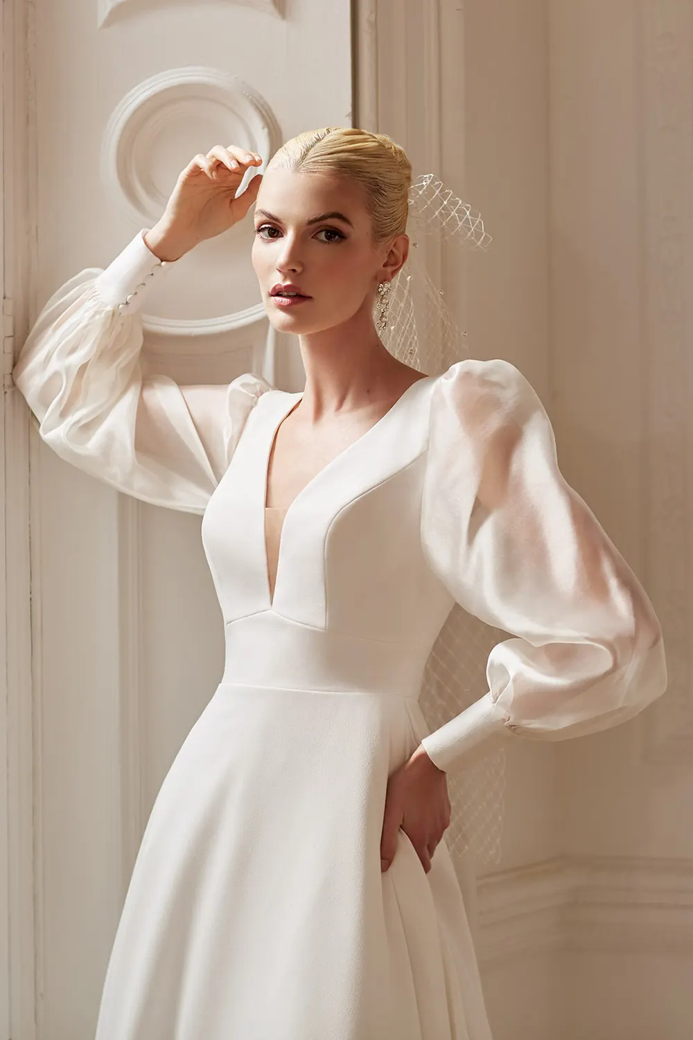 Das Modell Tegan von Ellis Bridals ist ein zeitloses A-Linien Brautkleid, mit einem tiefen V-Ausschnitt und einer betonten Taille. Das Brautkleid ist modern und minimalistisch.