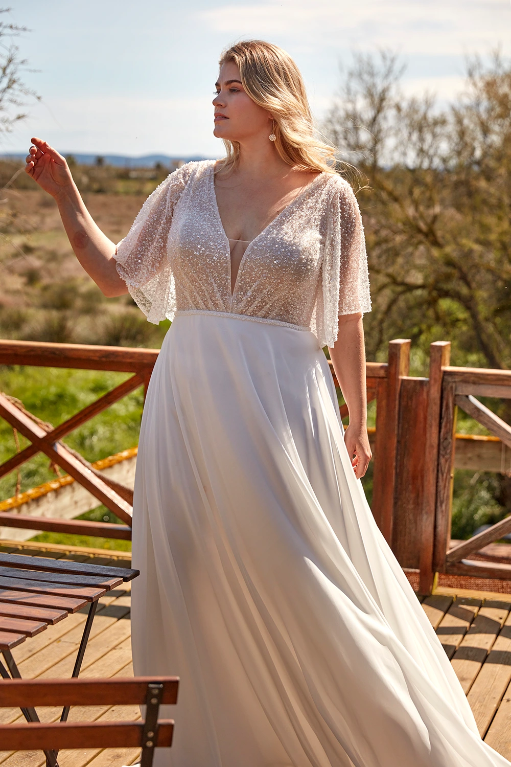 Das Modell Kayak Curvy von Fara Sposa ist ein leichtes Chiffon Brautkleid mit einem funkelnden Oberteil und Flügel Ärmelchen.
