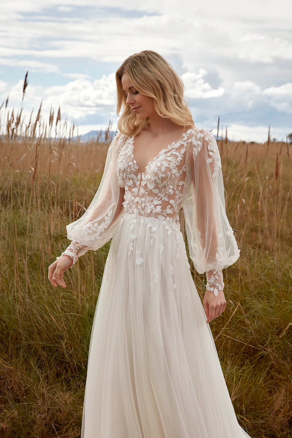 Das Modell Nenufar von Fara Sposa ist ein romantisches A-Linien Brautkleid mit langen Ärmeln und verspielter Spitzenapplikation.
