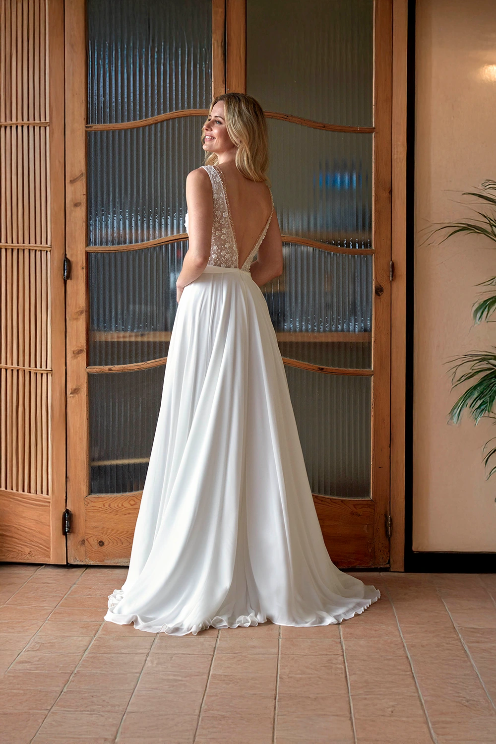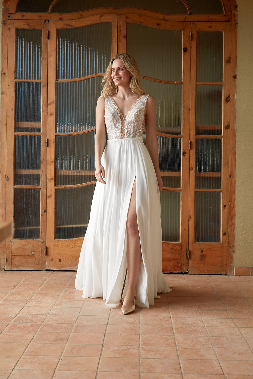 Das Modell Ola von Fara Sposa ist ein modernes Brautkleid, welches Romantik und Eleganz vereint. Blumenspitze, Glitzer, ein tiefer V-Ausschnitt und ein Beinschlitz vereinen diese Stile perfekt.