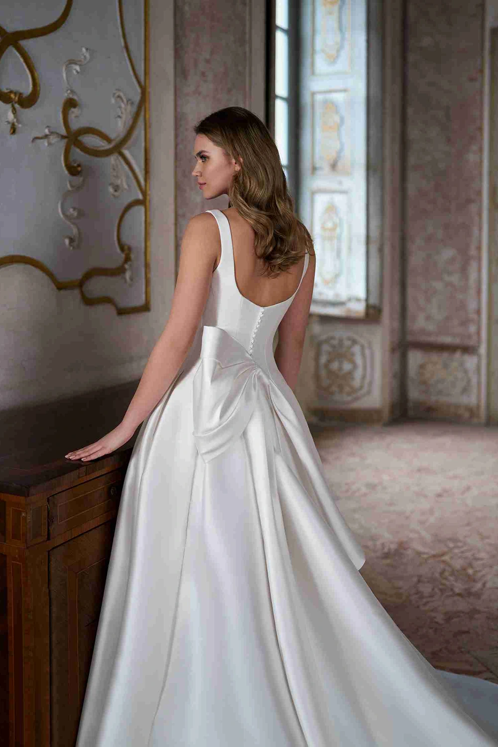 Das Modell Neela von Herve Paris ist ein cleanes Prinzessinnen Brautkleid mit breiten Trägern und einer großen Schleife im Rückenbereich.