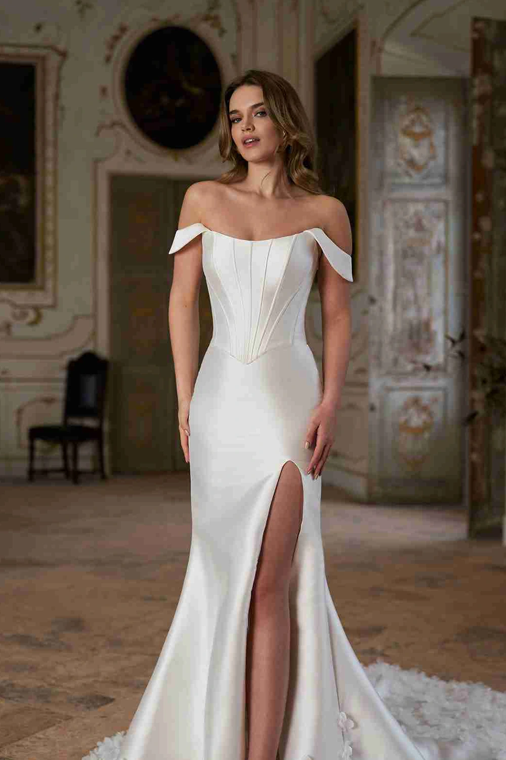 Das Modell Nixon (Braut-Top) von Herve Paris ist ein festes Corsagenoberteil im modernen Stil, die Carmenträger runden den Zweiteiler Look perfekt ab.