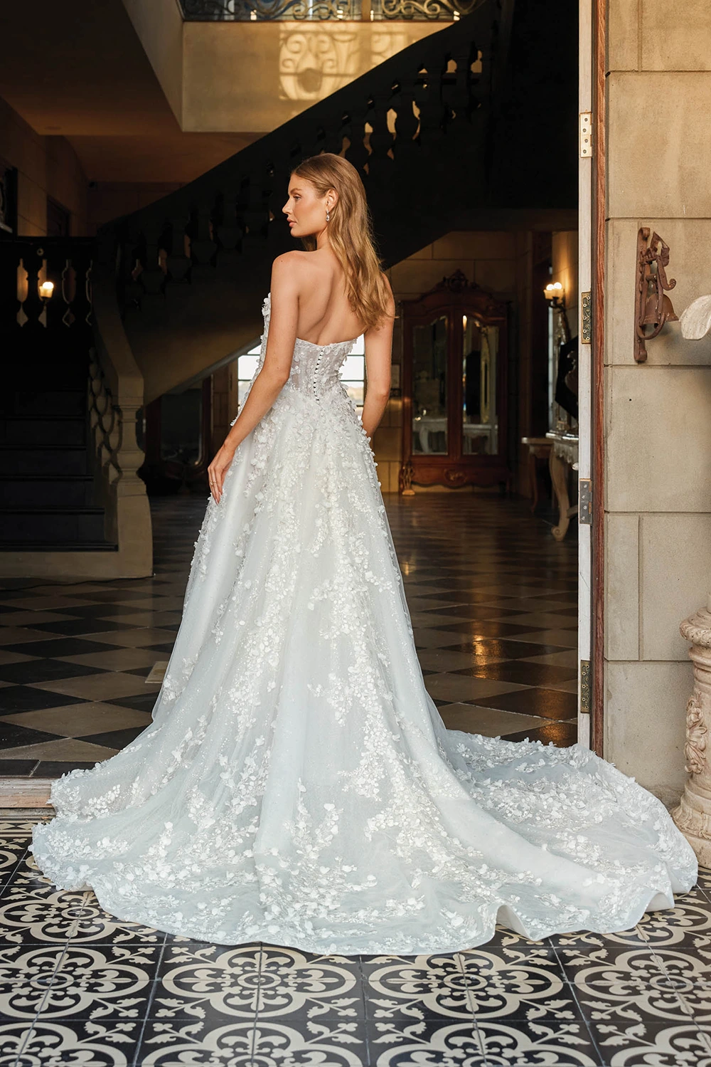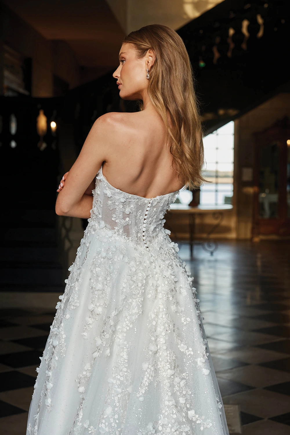 Das Modell Chianti von Jeune Bridal ist eine perfekte Mischung aus Romantik und Glamour, gefertigt aus Lagen zarter Stickereien, glitzerndem Tüll und 3D-Blumenmotiven.