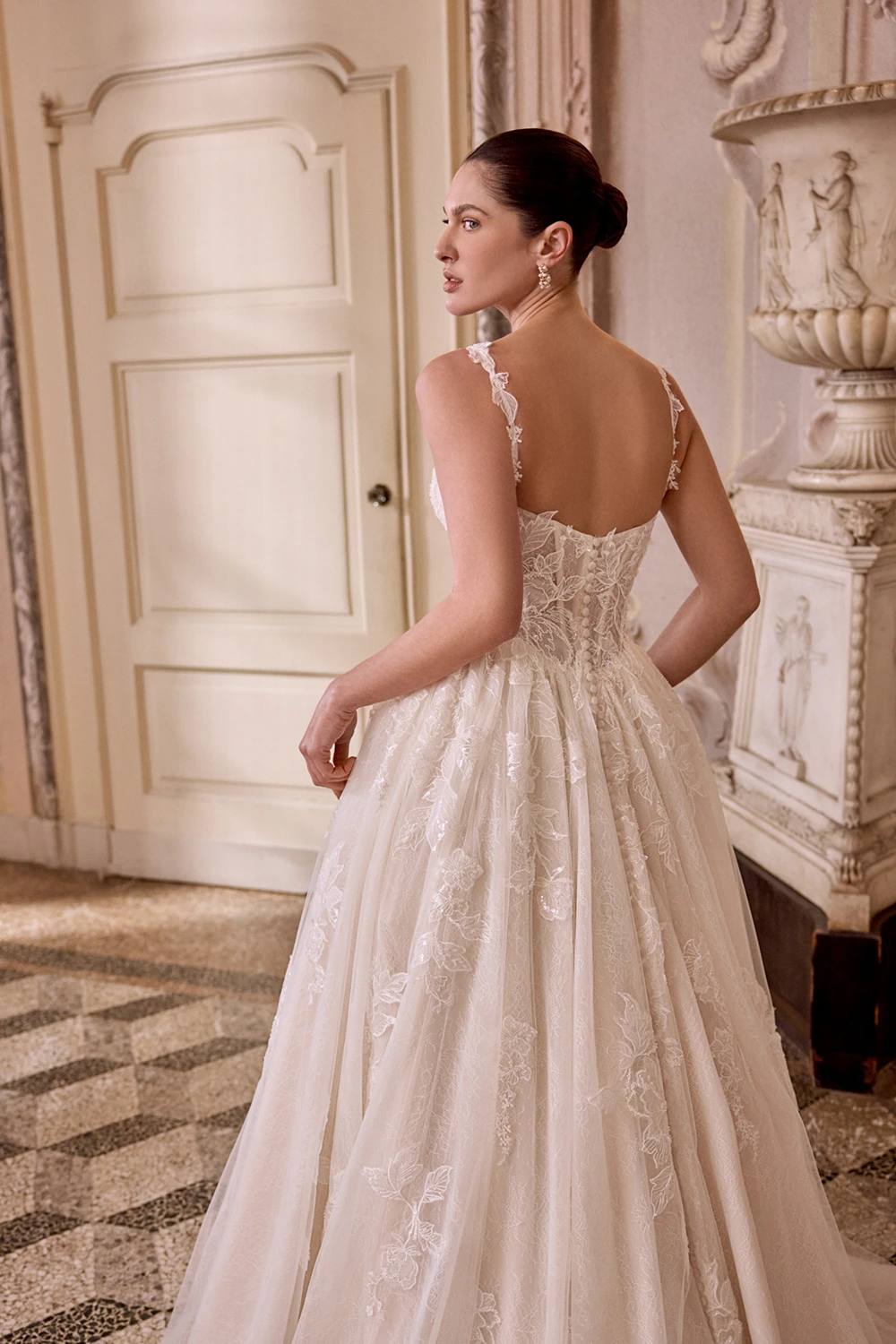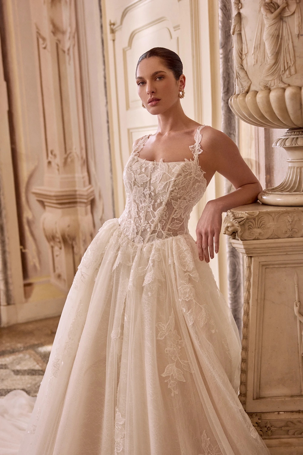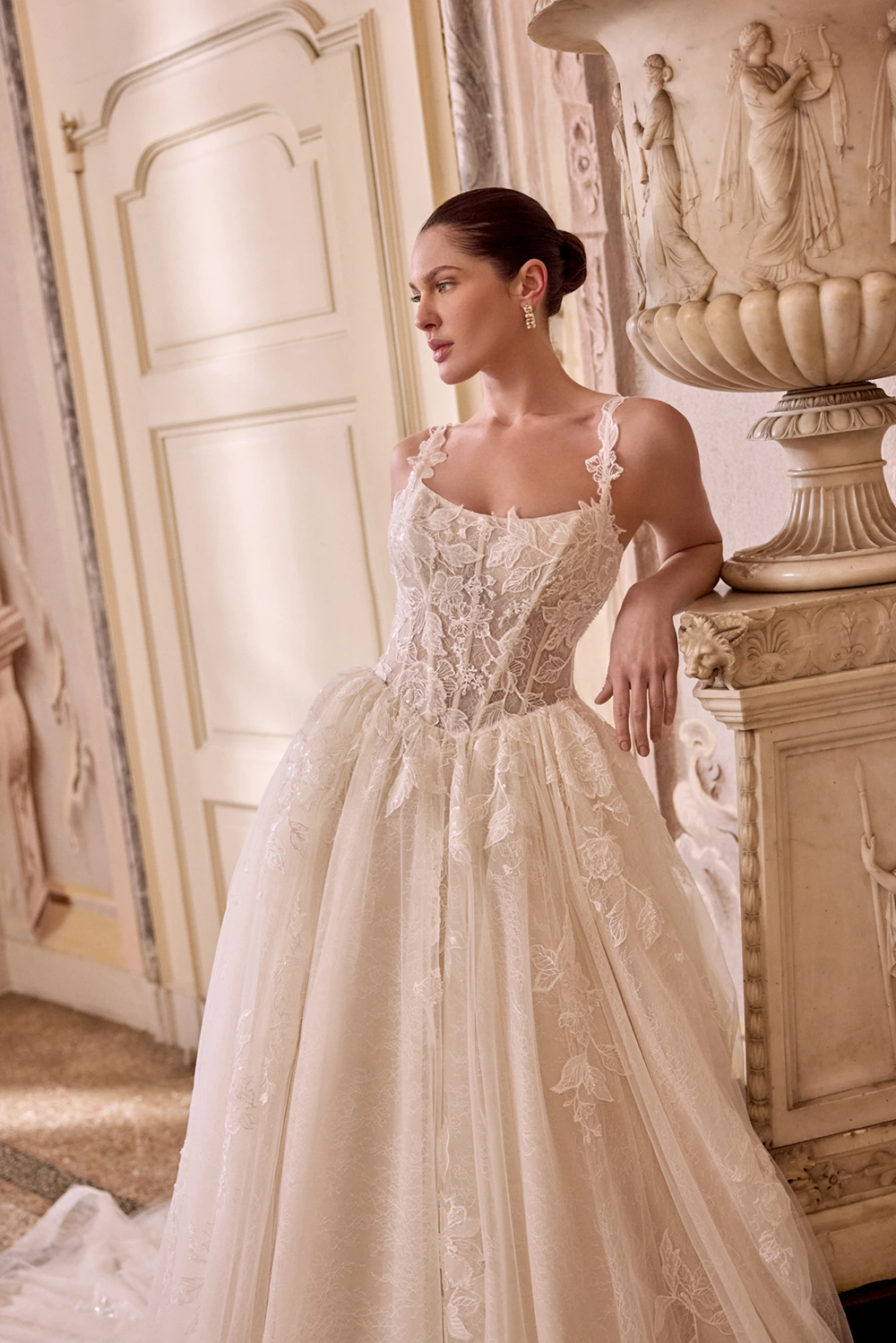 Das Modell Laura von Justin Alexander ist ein aufregendes Prinzessinnen Brautkleid mit großen Blumenapplikationen und Chantilly Spitze. Die floralen Spitzentröger vollenden den Look.