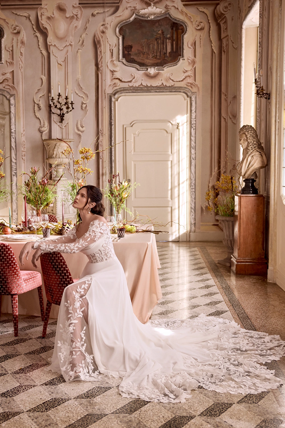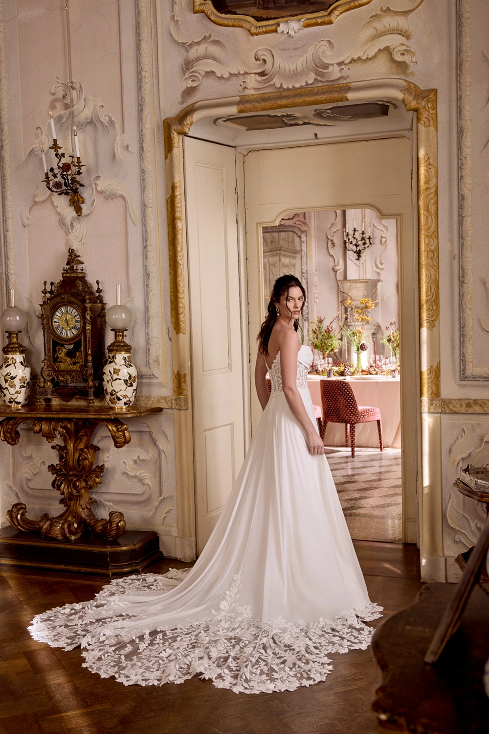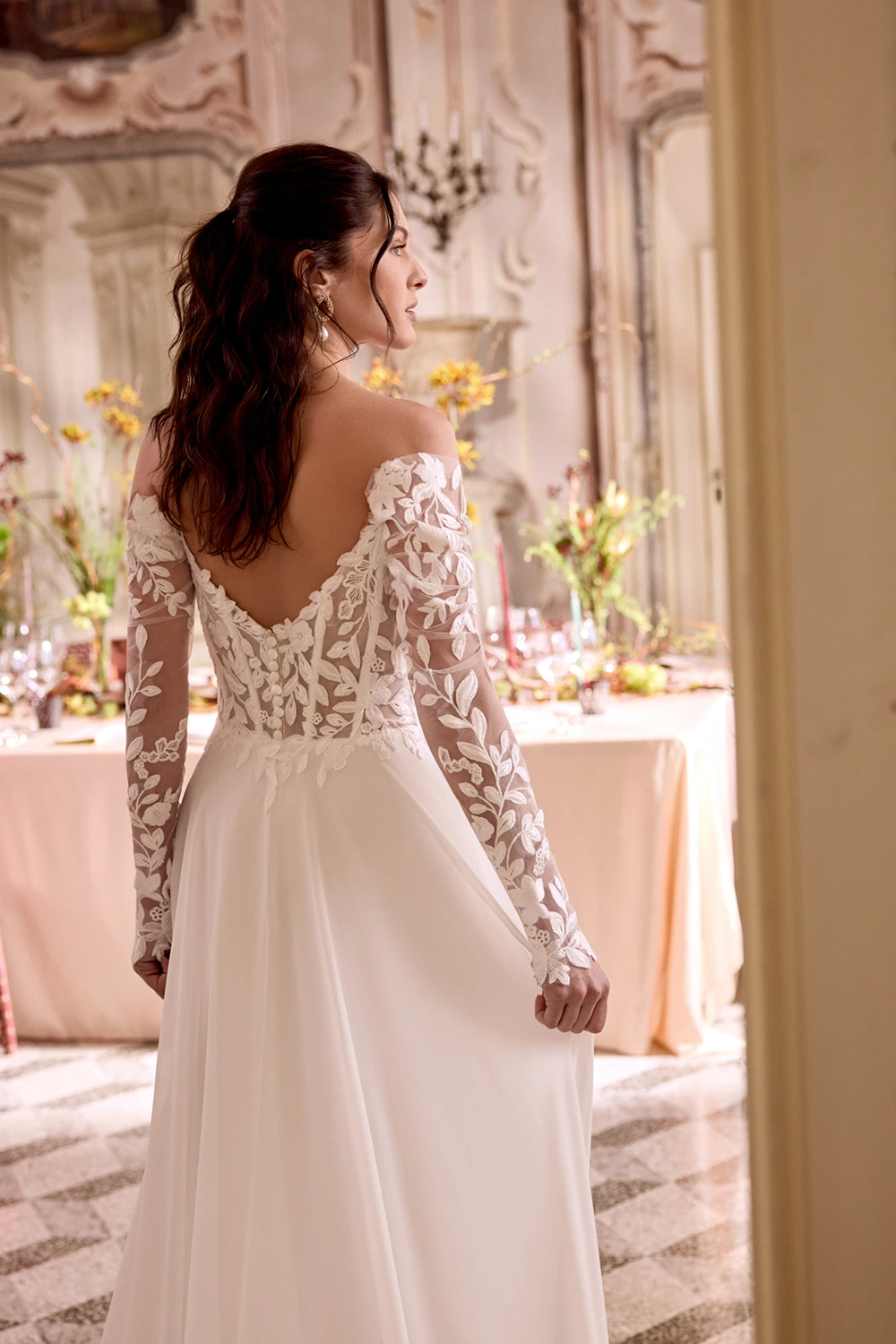 Das Modell Leila von Justin Alexander ist ein cleanes A-Linien Brautkleid mit romantischen Spitzendetails in der Corsage und im Rock. Die mit Spitze besetzte Schleppe wird hier zu deinem Wow-Moment.