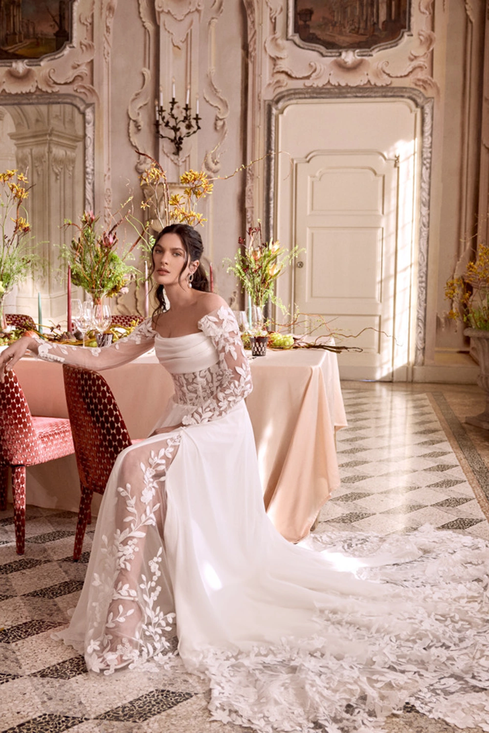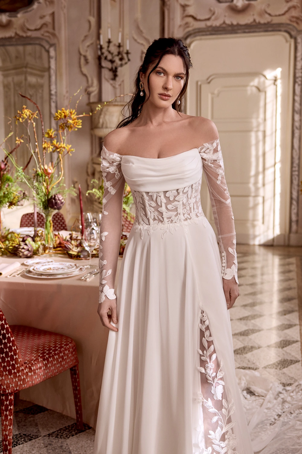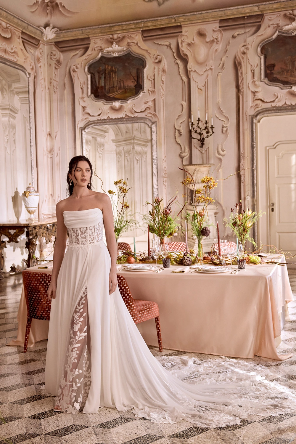 Das Modell Leila von Justin Alexander ist ein cleanes A-Linien Brautkleid mit romantischen Spitzendetails in der Corsage und im Rock. Die mit Spitze besetzte Schleppe wird hier zu deinem Wow-Moment.