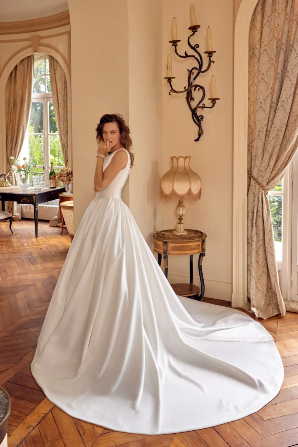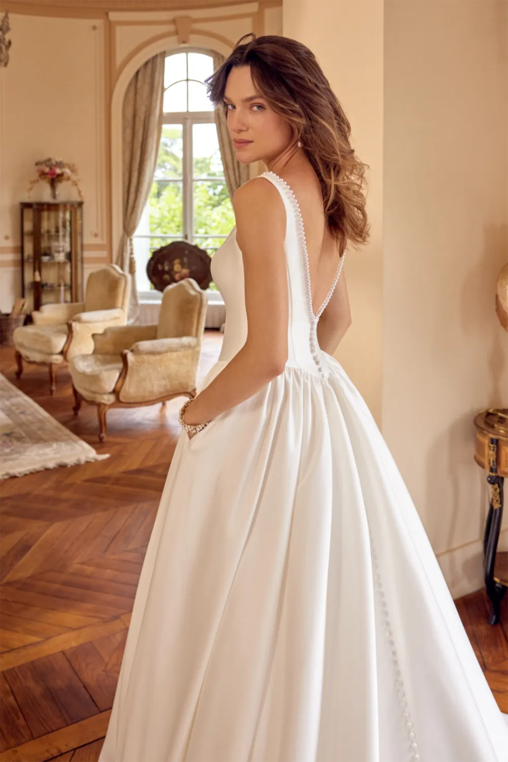 Das Modell Mckenna von Justin Alexander ist ein klassisches, schlichtes Prinzessinnen-Brautkleid mit tiefen V-Rücken.
