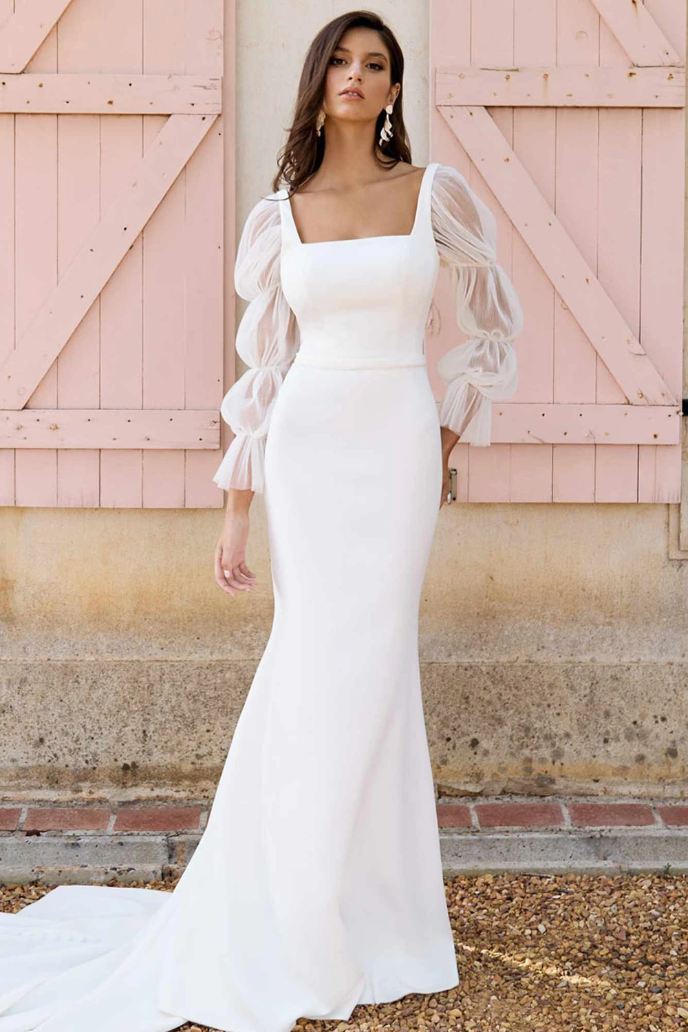 Das Modell Tate von Kelsey Rose ist ein schlichtes Fit-and-Flare Brautkleid mit eckigen Ausschnitt.