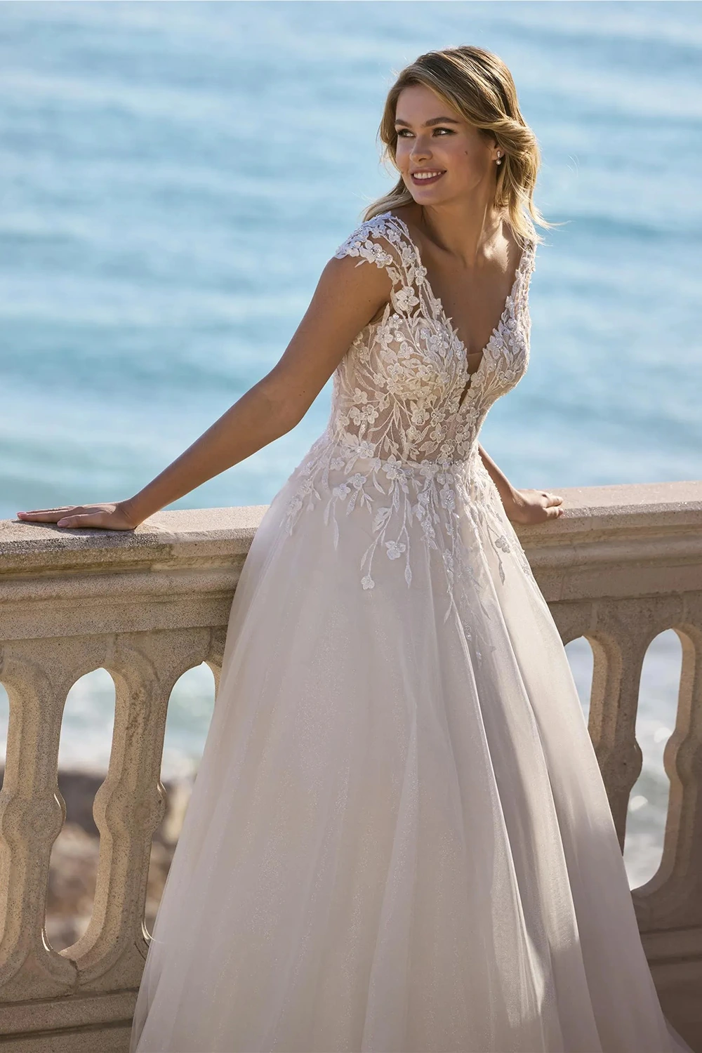 Das Modell Borage von Ladybird ist ein zart fließendes A-Linie Brautkleid mit einem Oberteil besetzt aus floralen Spitzenapplikationen.