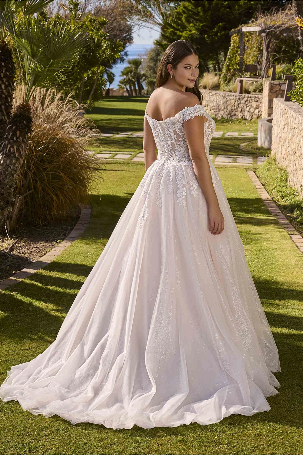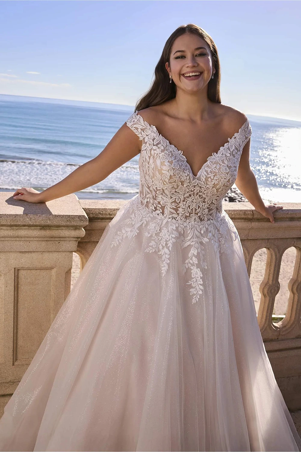 Das Modell Lelies von Ladybird ist ein funkelndes A-Linien Brautkleid mit einem semitransparenten Oberteil aus Spitze und Carmenträgern.