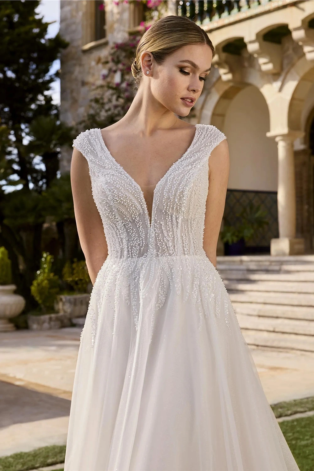 Das Modell Sannah von Ladybird ist ein leicht fließendes A-Linien Brautkleid mit modernen Applikationen aus Glitersteinen.