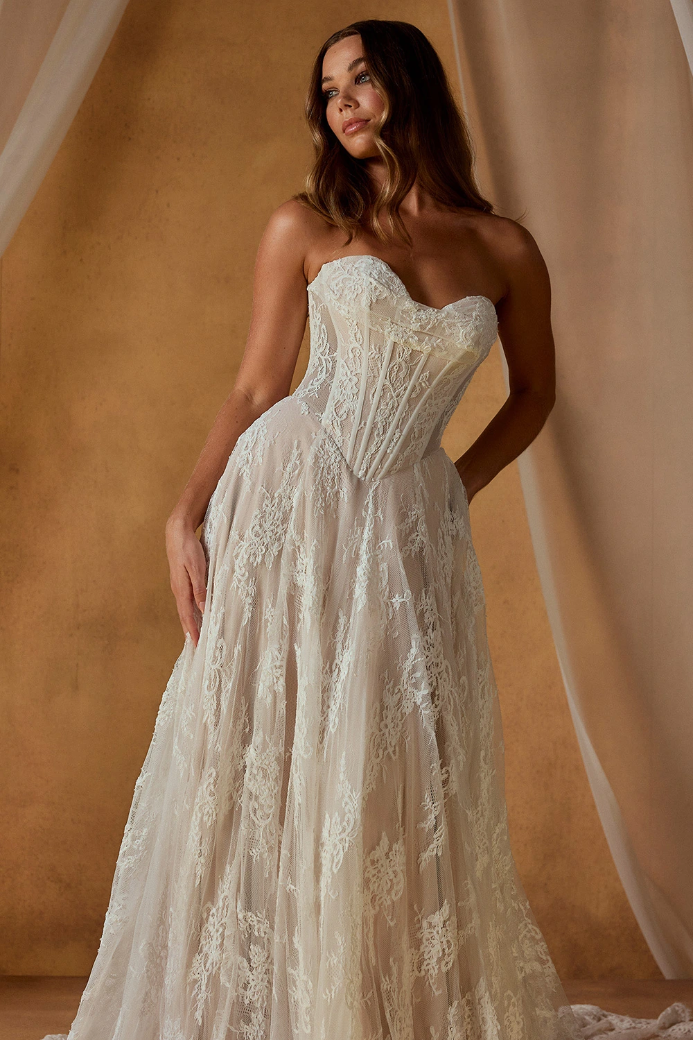 Das Modell Nivaya von Madi Lane ist ein exklusives A-Linien Brautkleid mit all over Chantilly-Spitze, dass dich royal strahlen lässt.