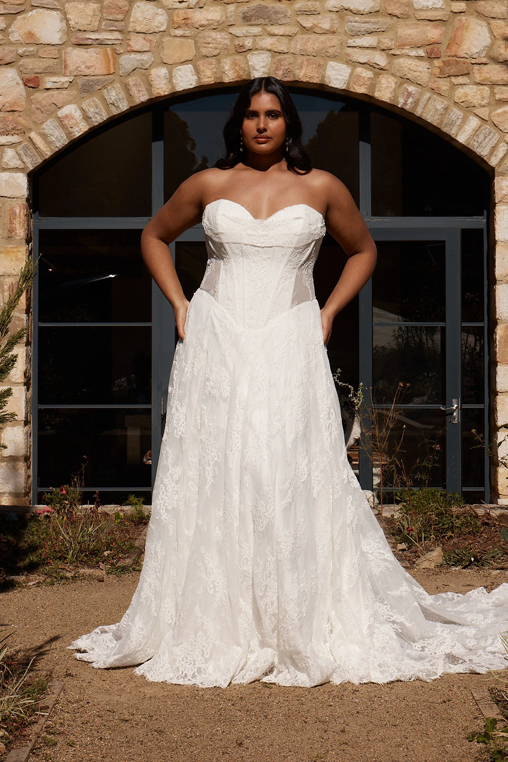 Das Modell Nivaya curvy von Madi Lane ist ein exklusives A-Linien Brautkleid mit all over Chantilly-Spitze, dass dich royal strahlen lässt.
