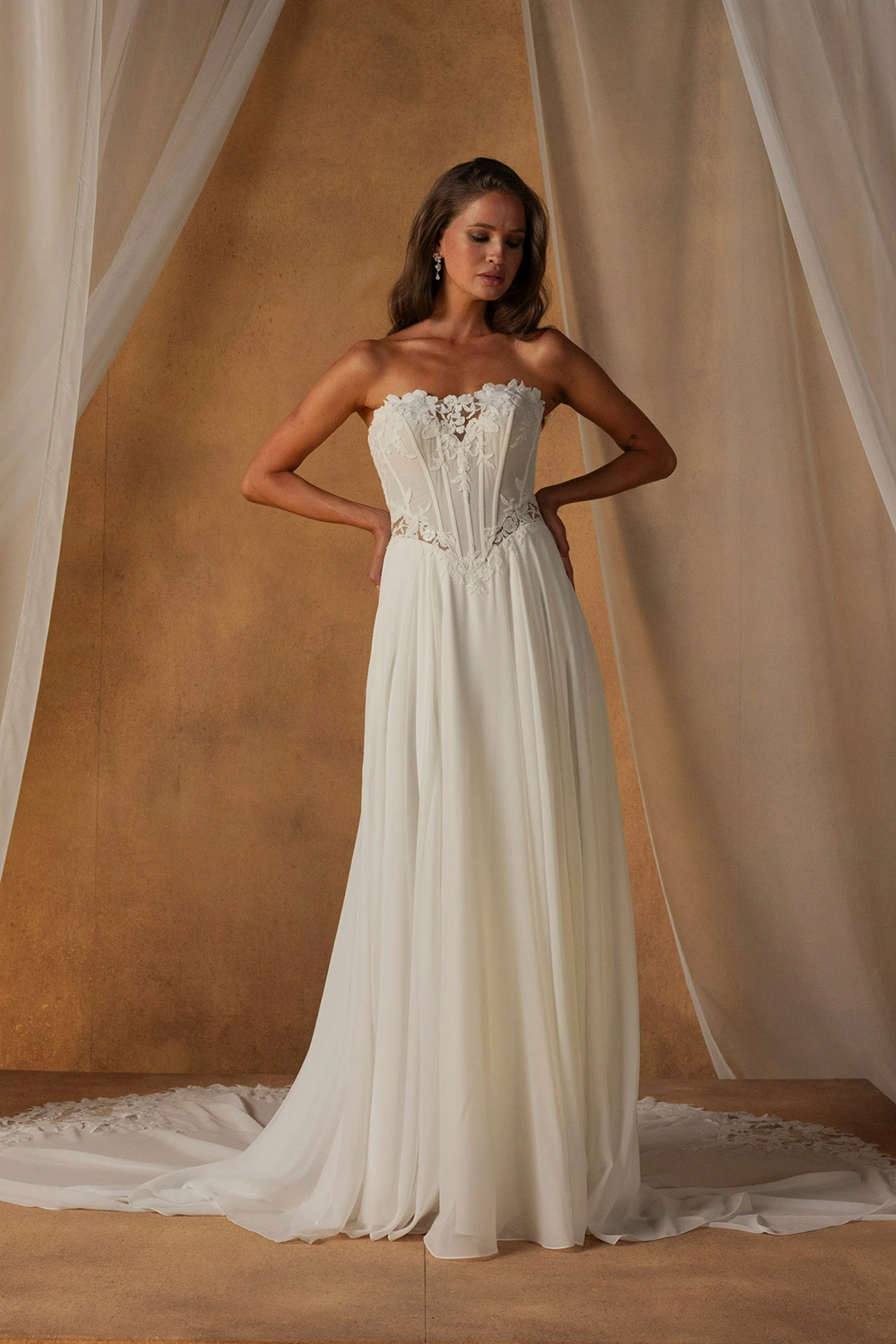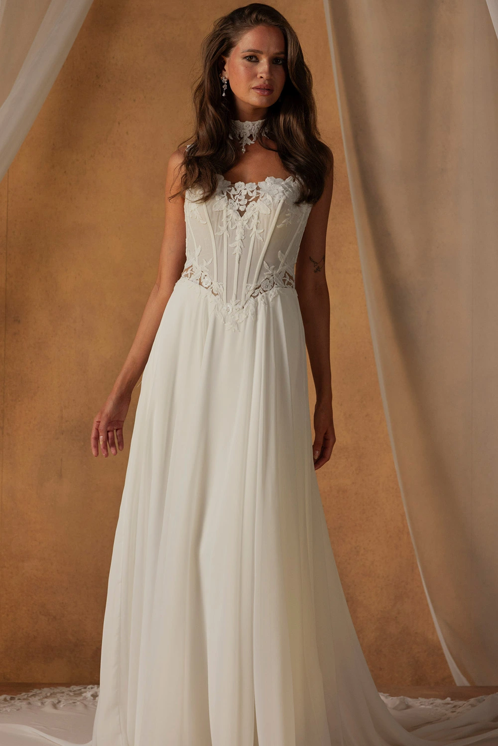 Das Modell Nixon von Madi Lane ist ein klassisches, fließendes A-Linien Brautkleid mit zartem Chiffonrock und elegentem Oberteil.