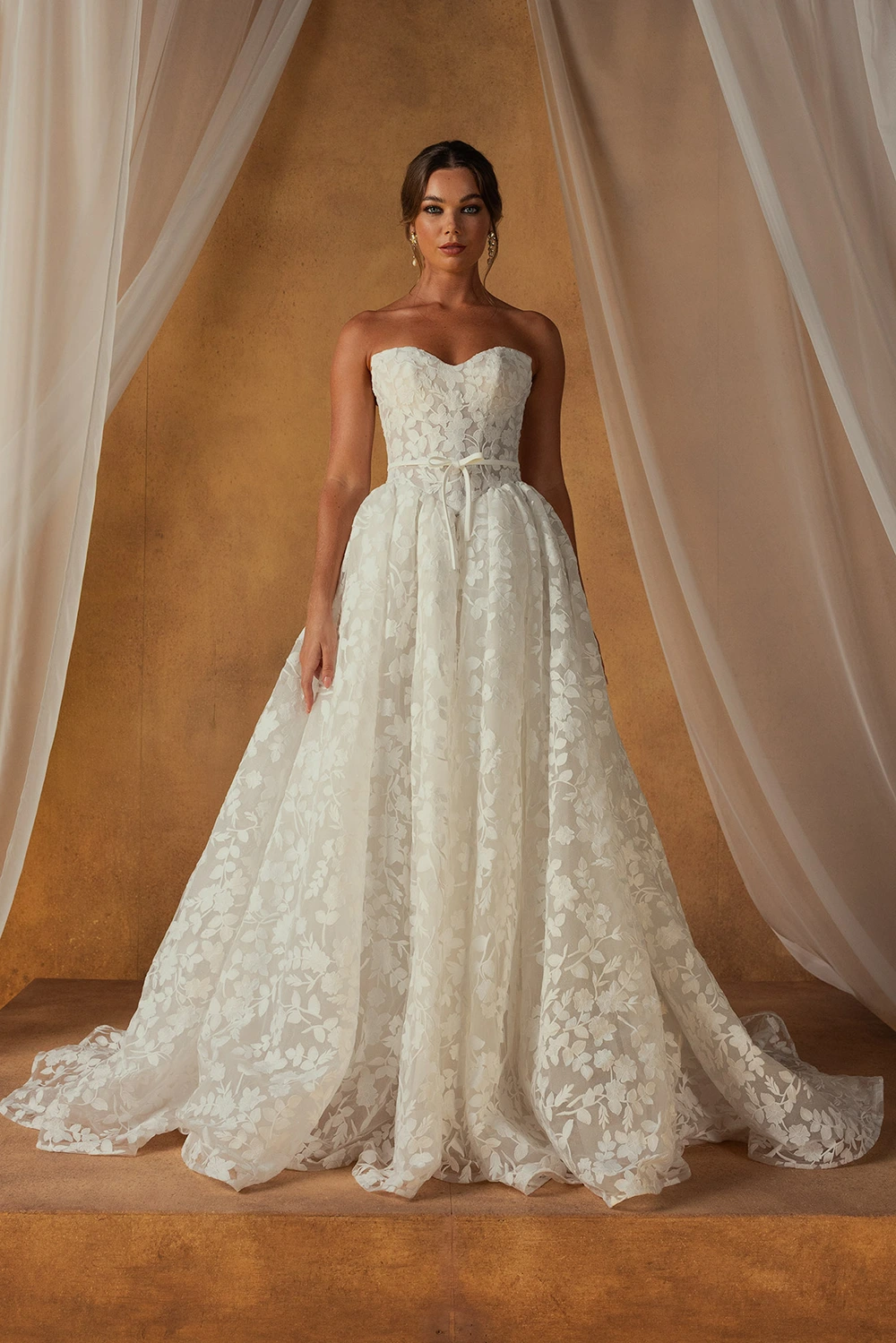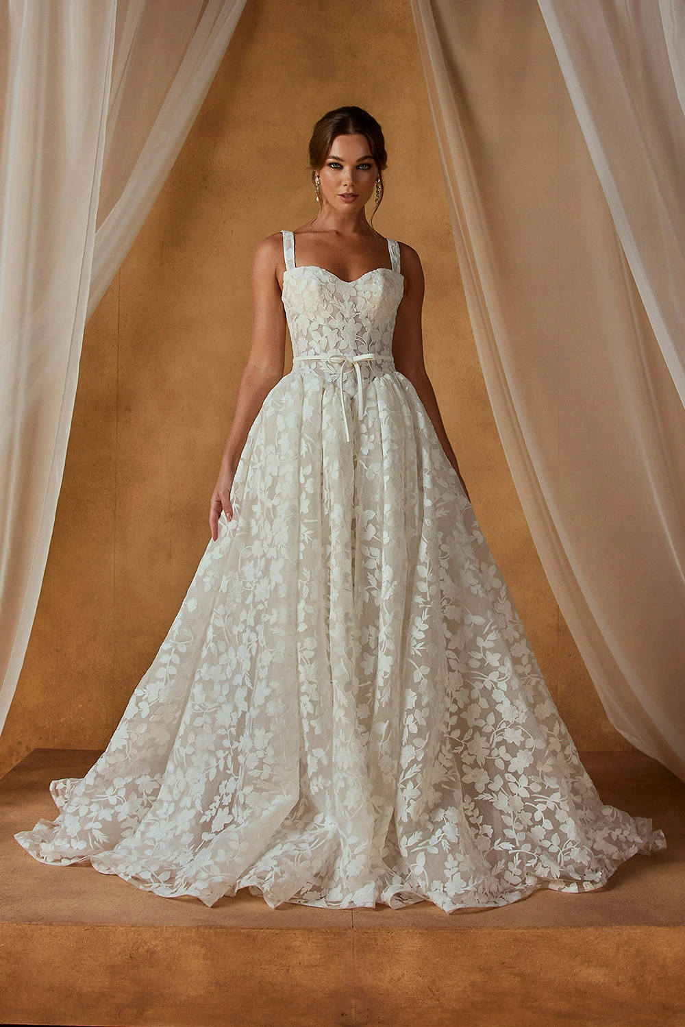 Das Modell Noble von Madi Lane ist ein modernes, weit ausladendes A-Linien Brautkleid mit abnehmbaren Ärmeln.