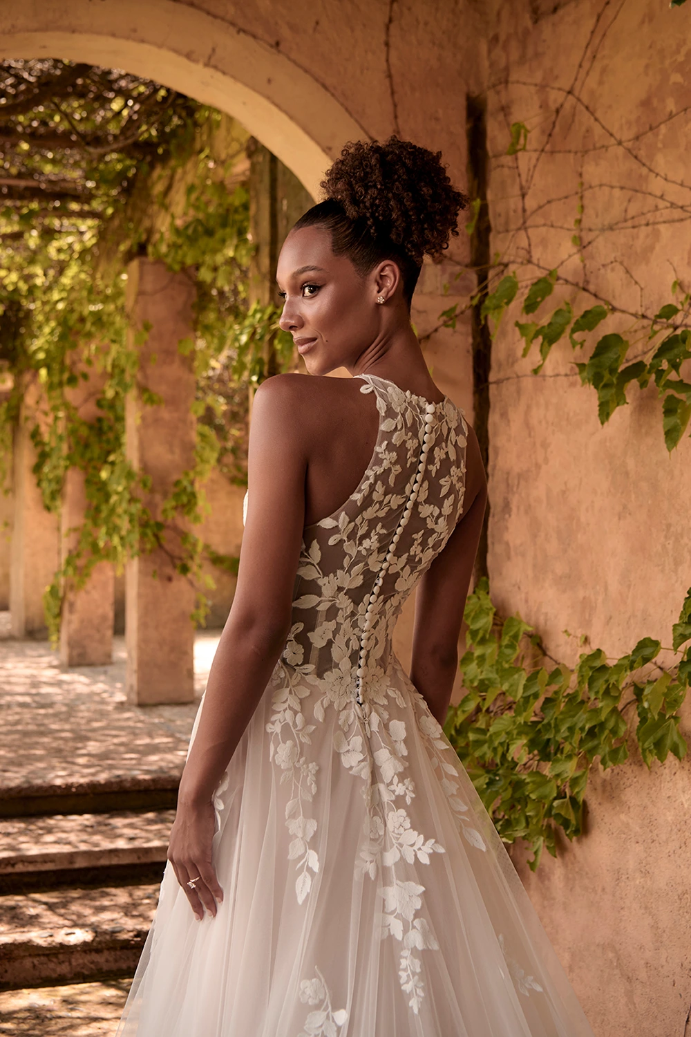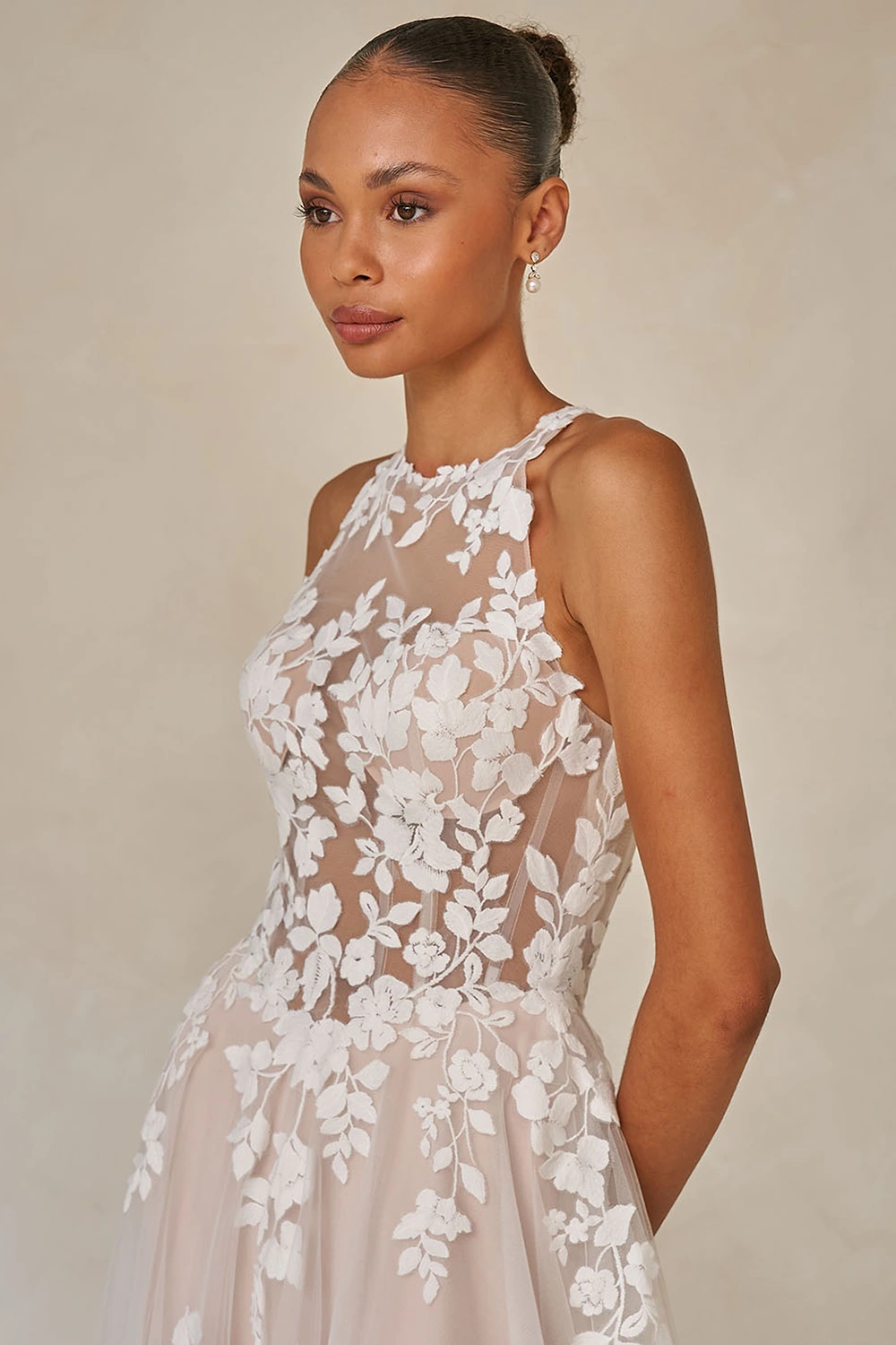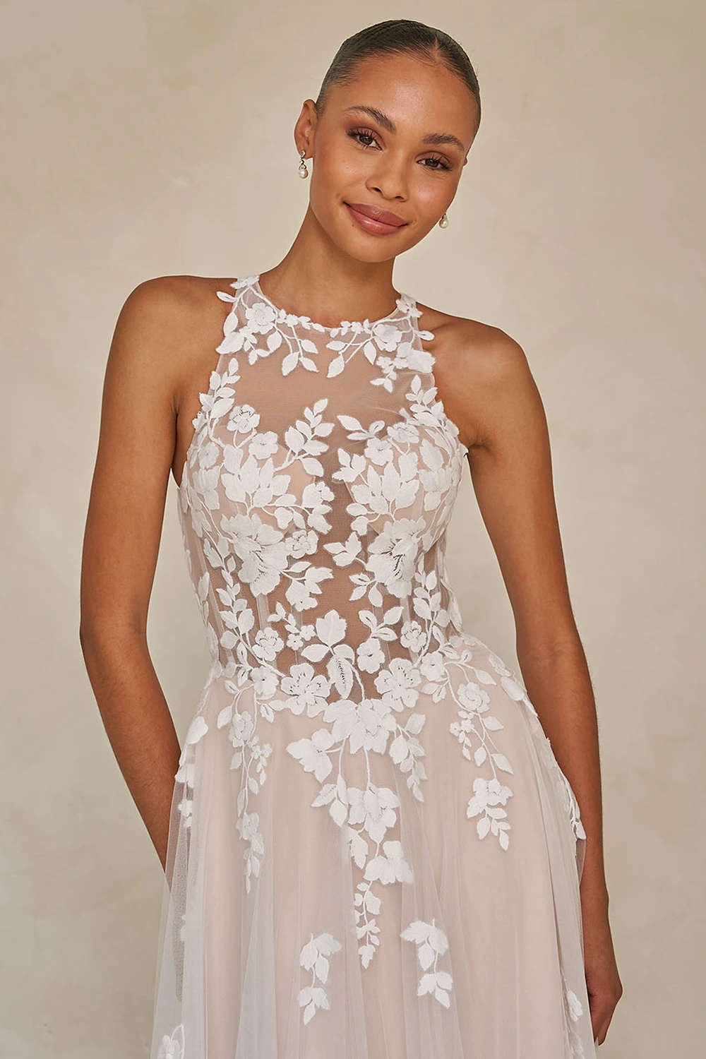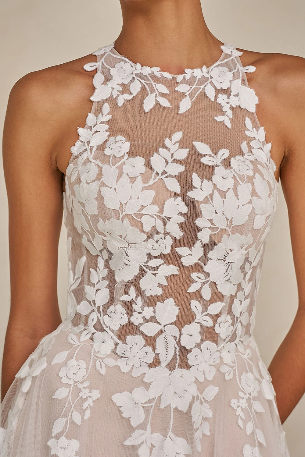 Das Modell Warner von Madi Lane ist ein A-Linien Brautkleid mit einem hochgeschlossenem Oberteil aus semitransparenter Spitze .
