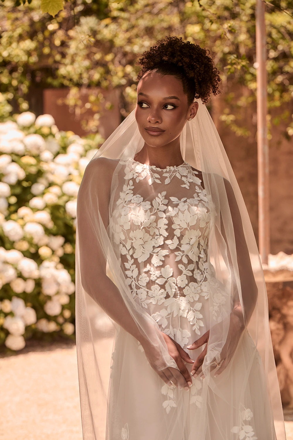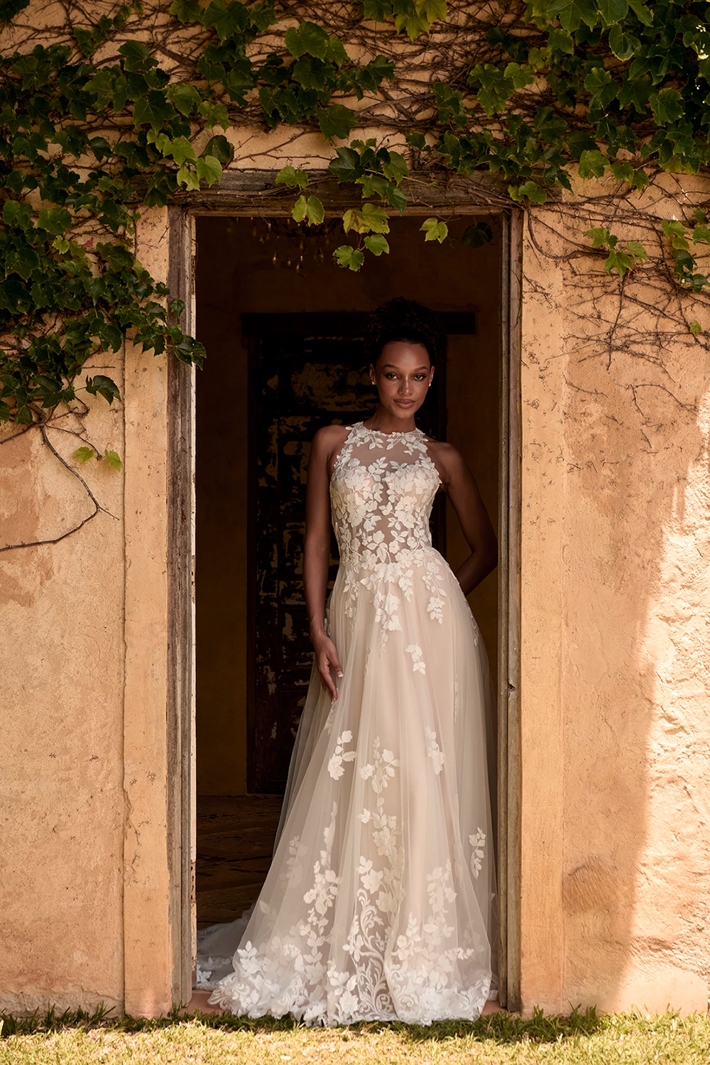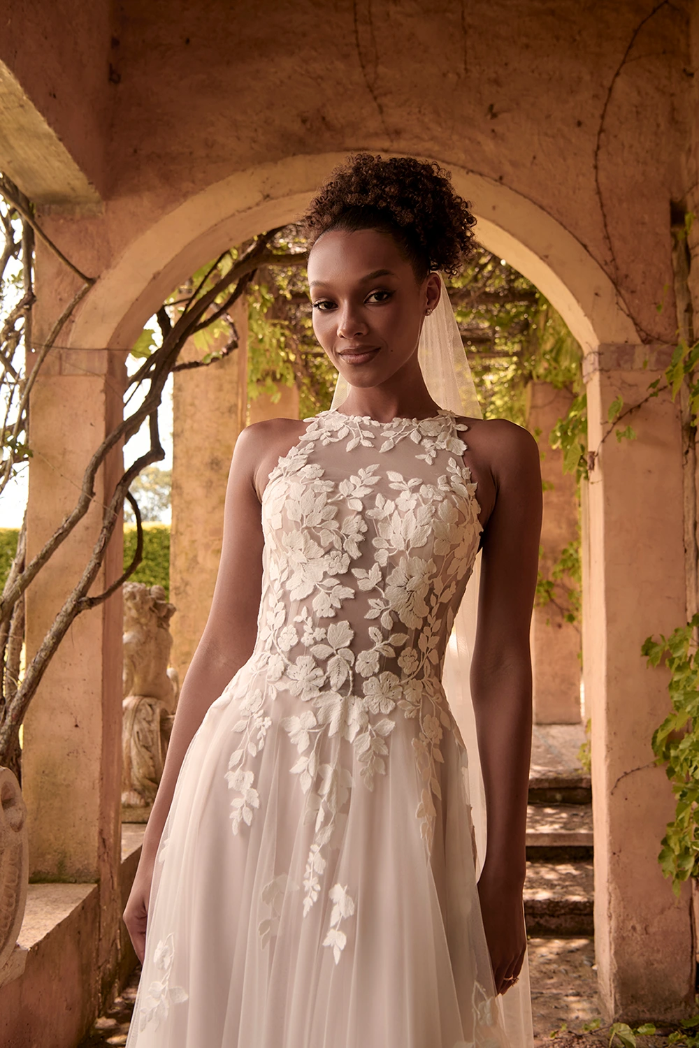 Das Modell Warner von Madi Lane ist ein A-Linien Brautkleid mit einem hochgeschlossenem Oberteil aus semitransparenter Spitze .