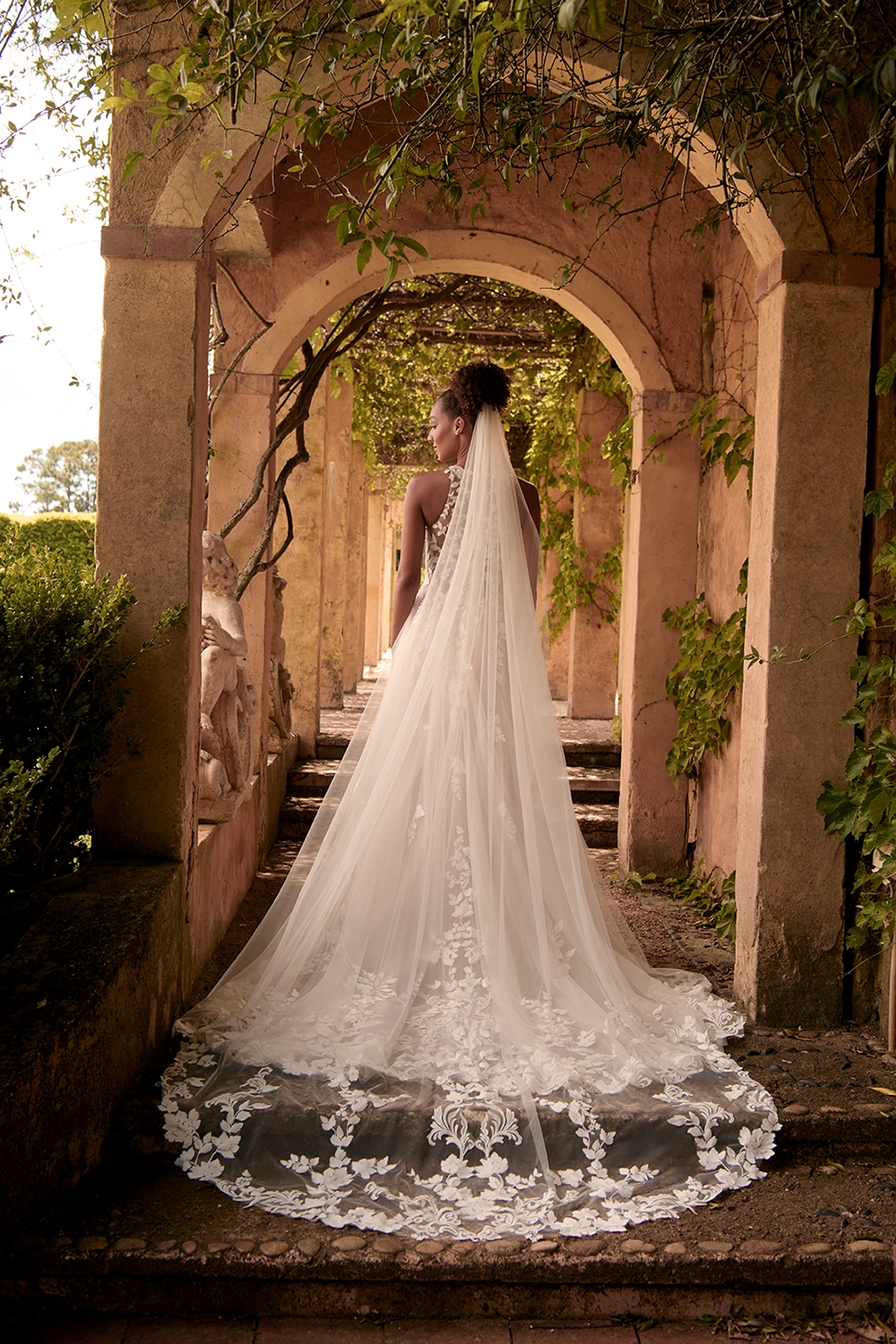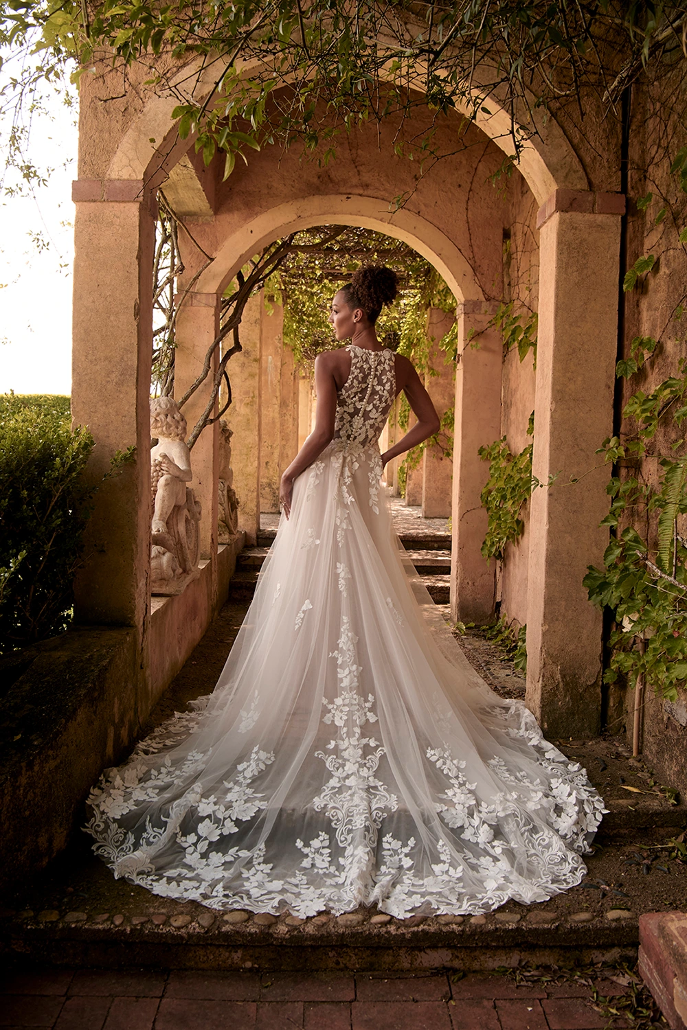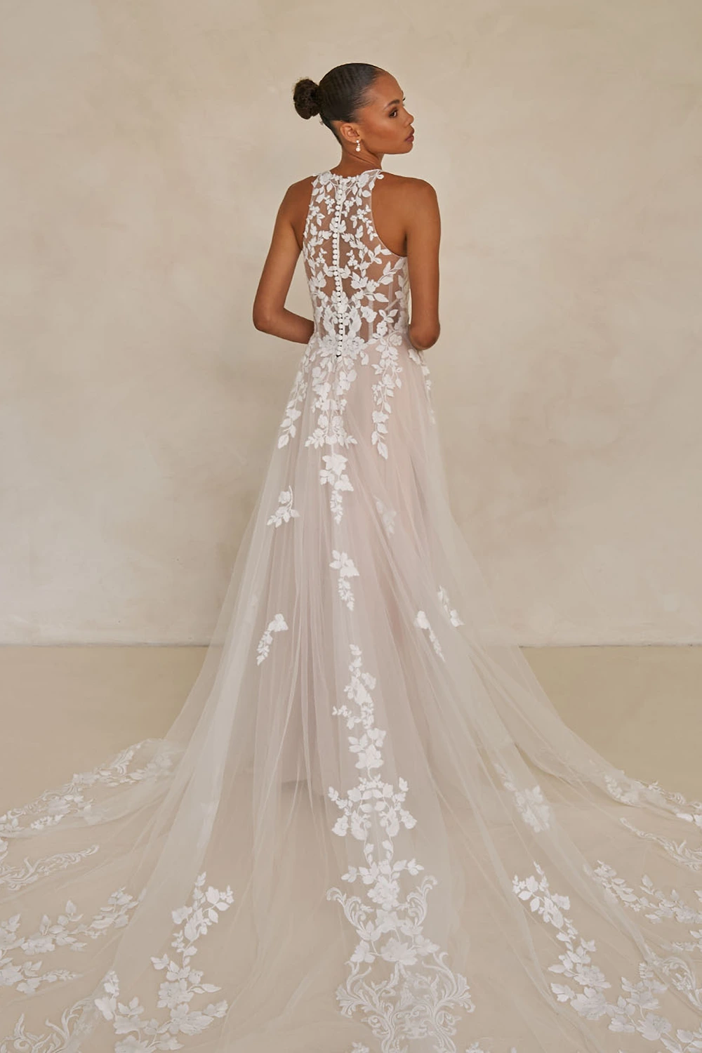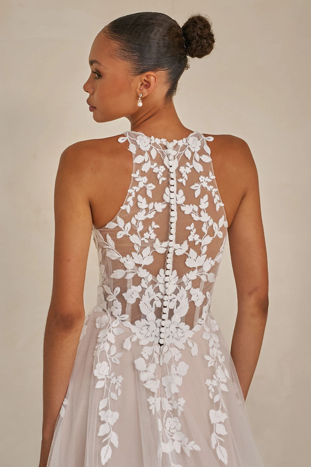 Das Modell Warner von Madi Lane ist ein A-Linien Brautkleid mit einem hochgeschlossenem Oberteil aus semitransparenter Spitze .