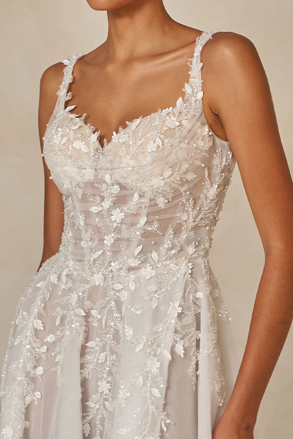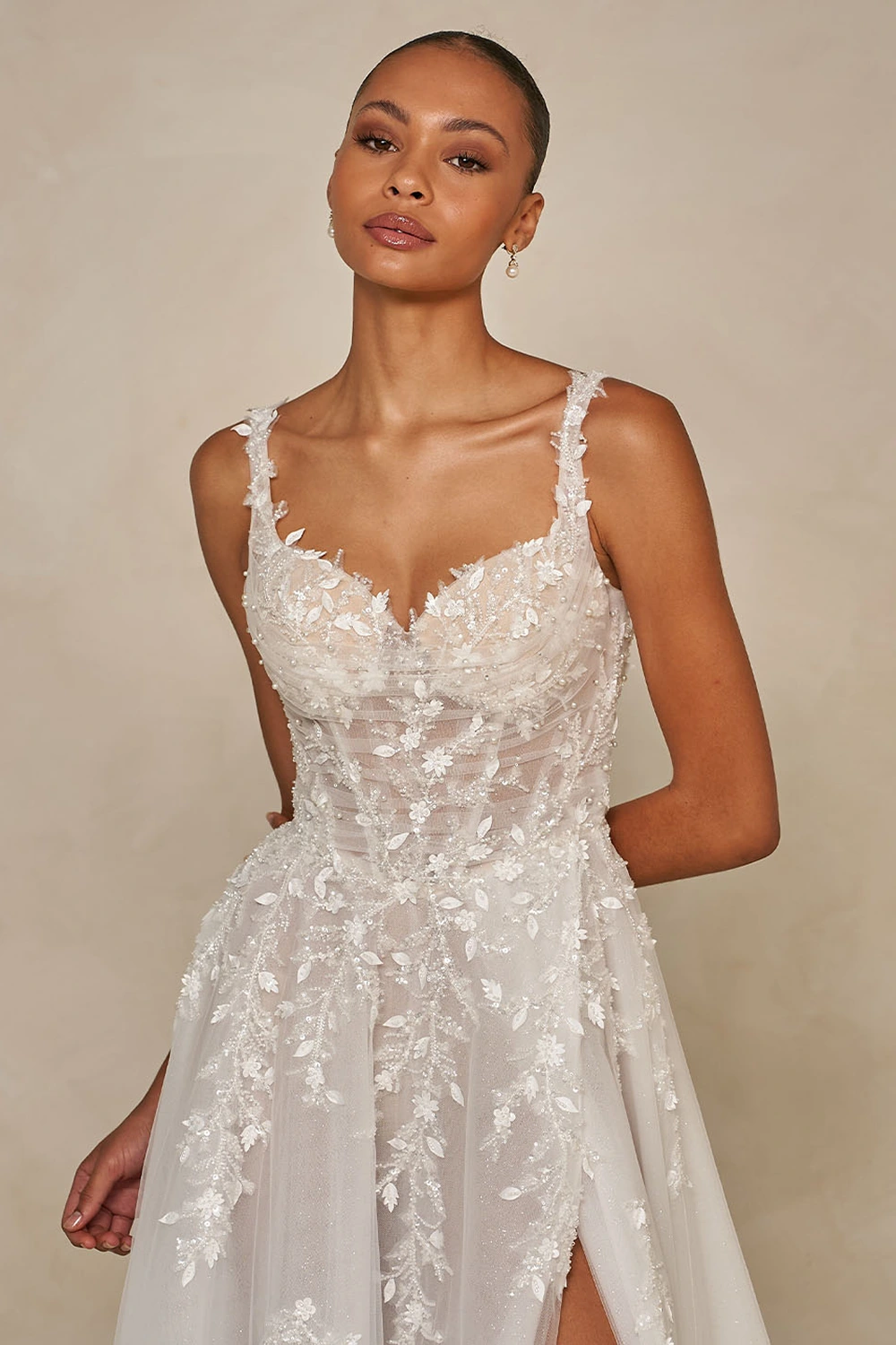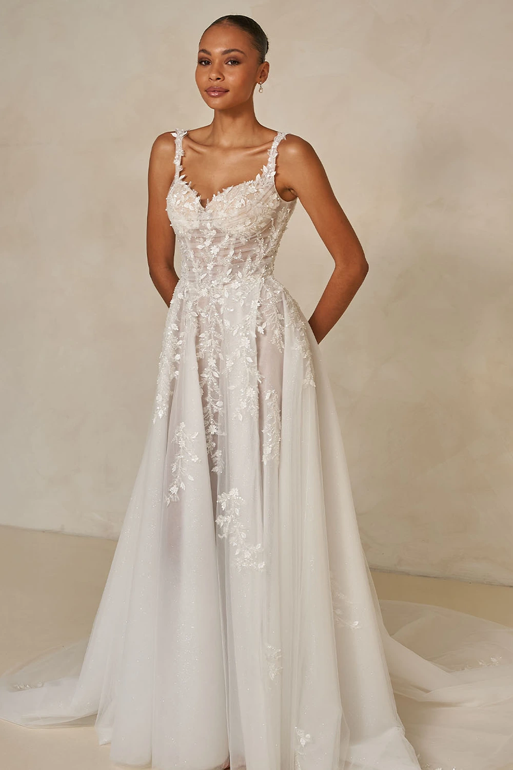 Das Modell Webb von Madi Lane ist ein glamouröses A-Linien Brautkleid mit Perlenspitze, Glitzertüll und aufwendigen 3D Blumenmotiven. Das Illusionsmieder verfügt über einen klassischen Herzausschnitt mit breiten, unterstützenden Trägern.