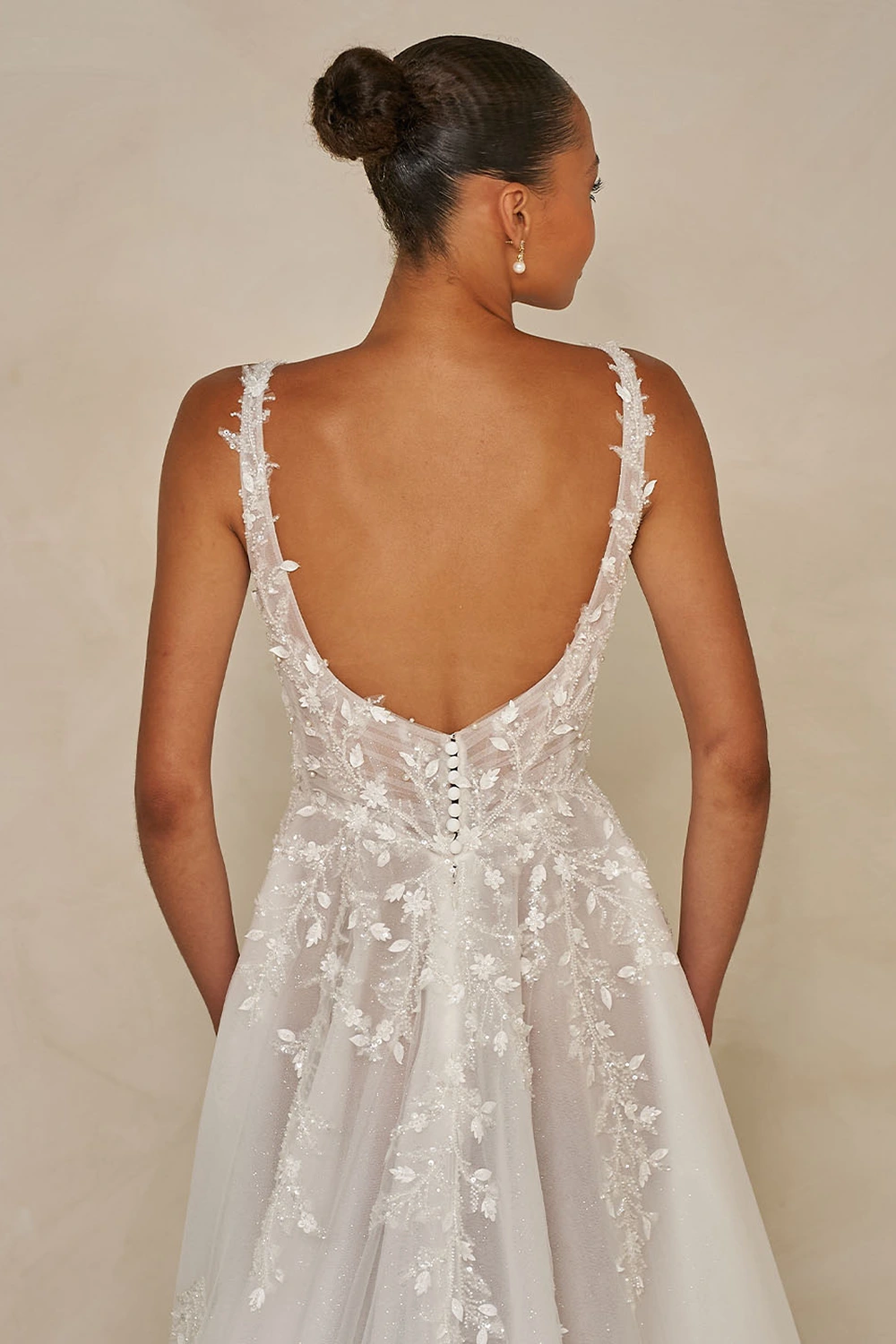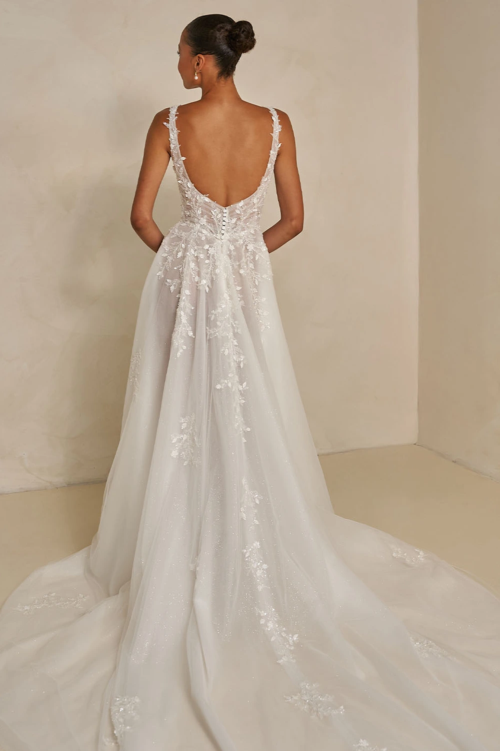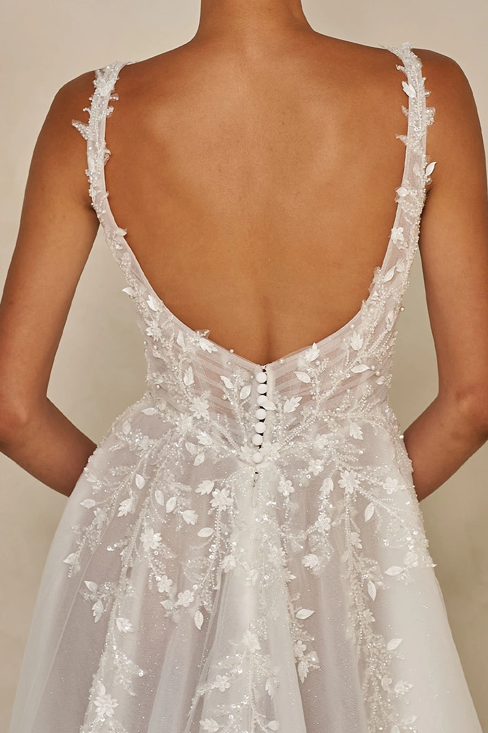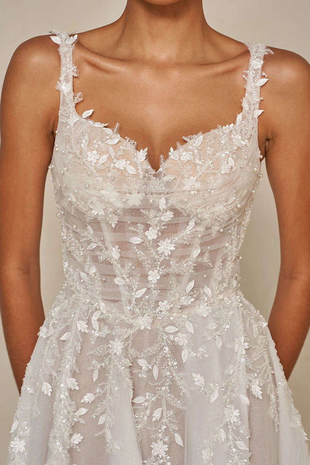 Das Modell Webb von Madi Lane ist ein glamouröses A-Linien Brautkleid mit Perlenspitze, Glitzertüll und aufwendigen 3D Blumenmotiven. Das Illusionsmieder verfügt über einen klassischen Herzausschnitt mit breiten, unterstützenden Trägern.