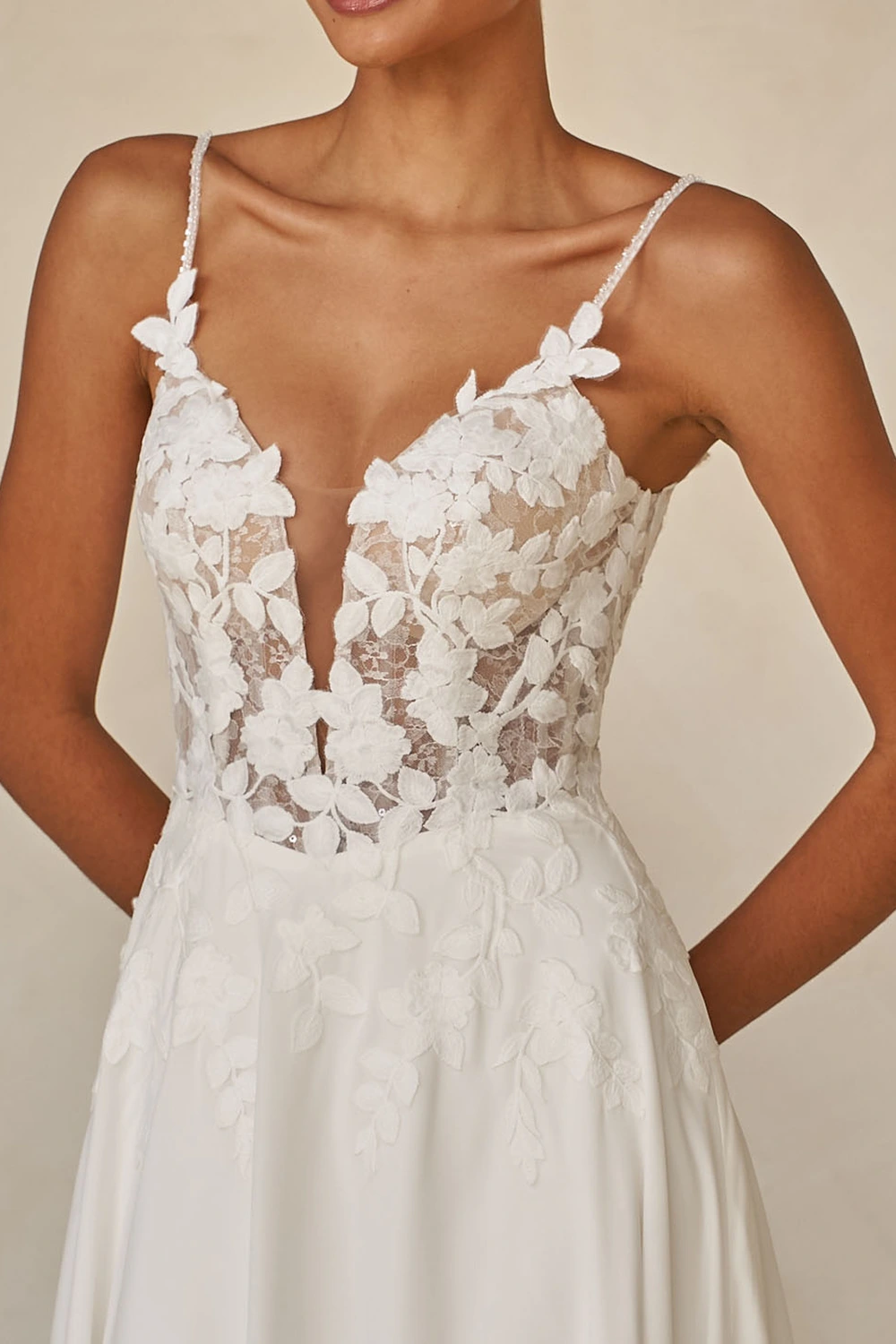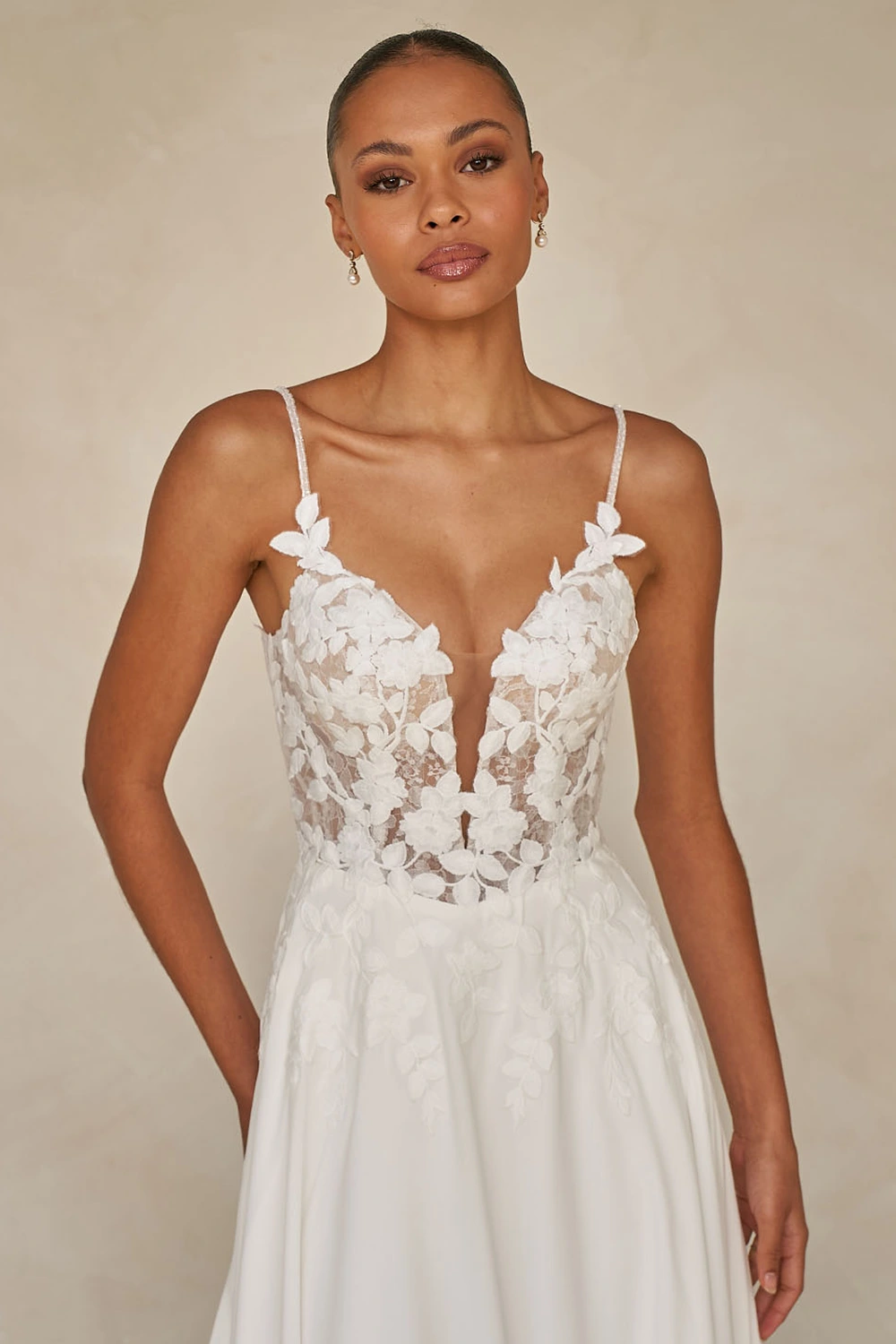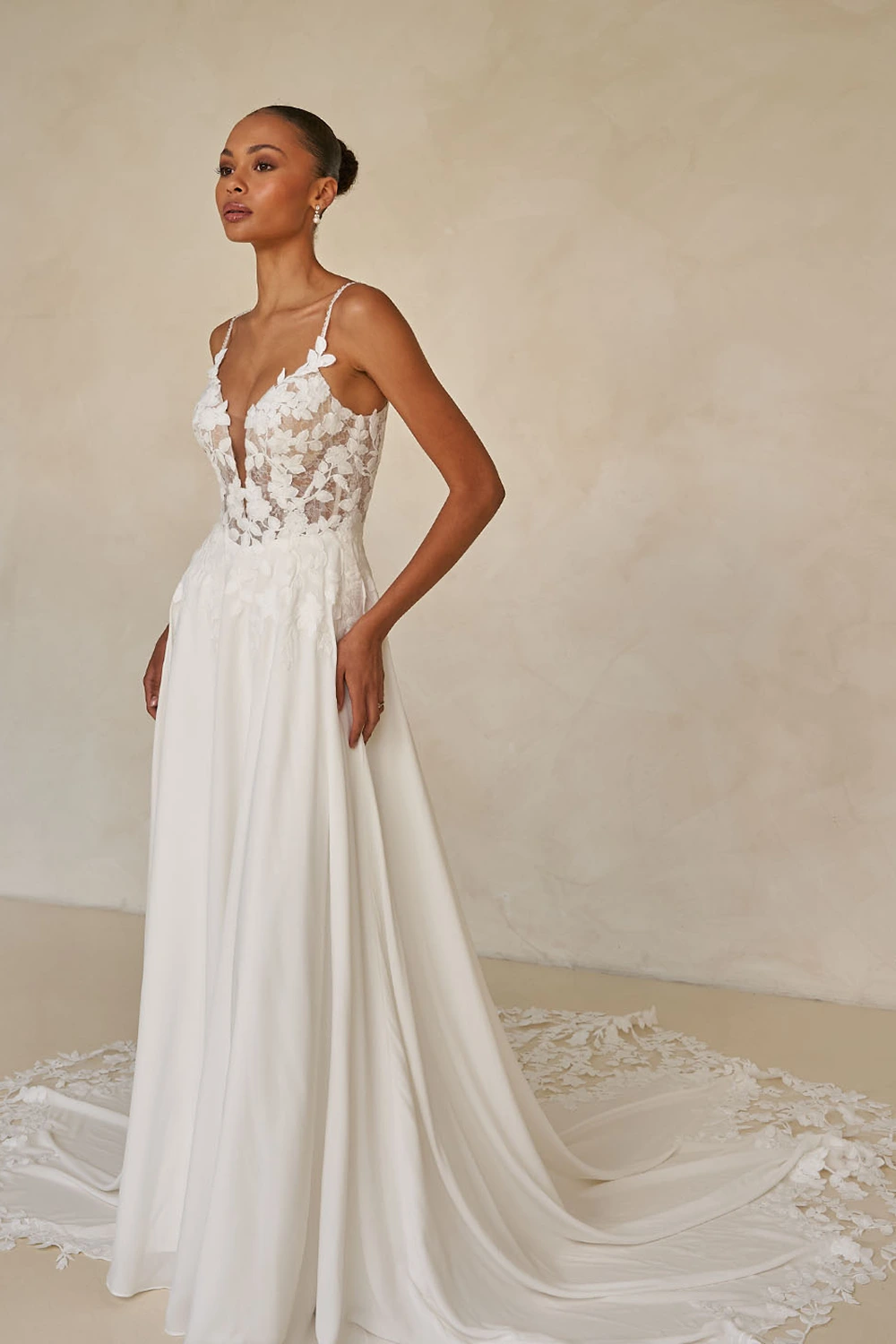 Das Modell Whyte von Madi Lane ist ein zart fließendes A-Linien Brautkleid eine Komposition aus Pailletten-Chantilly-Spitze, matter Stickerei und luftigem Chiffon verleiht Tiefe und Dimension.