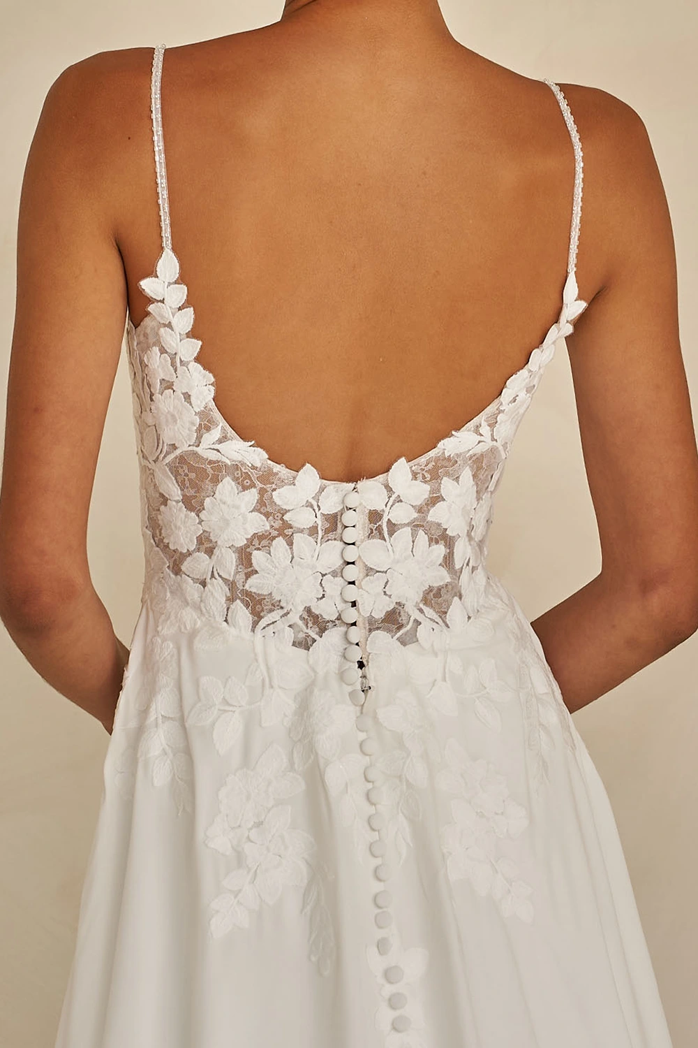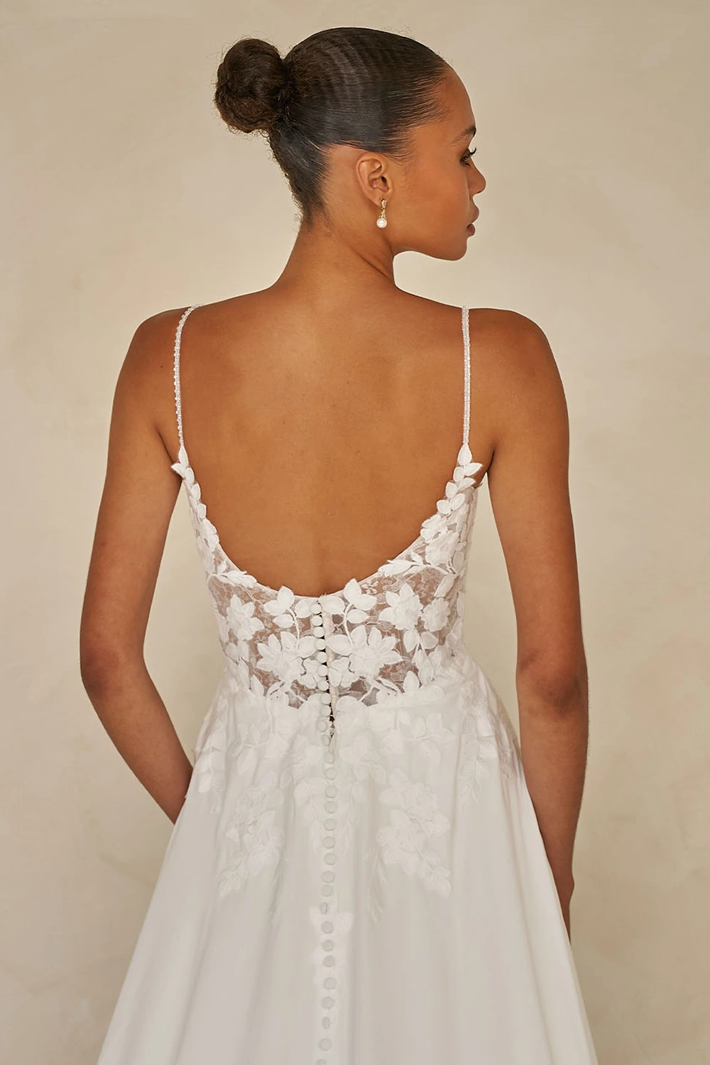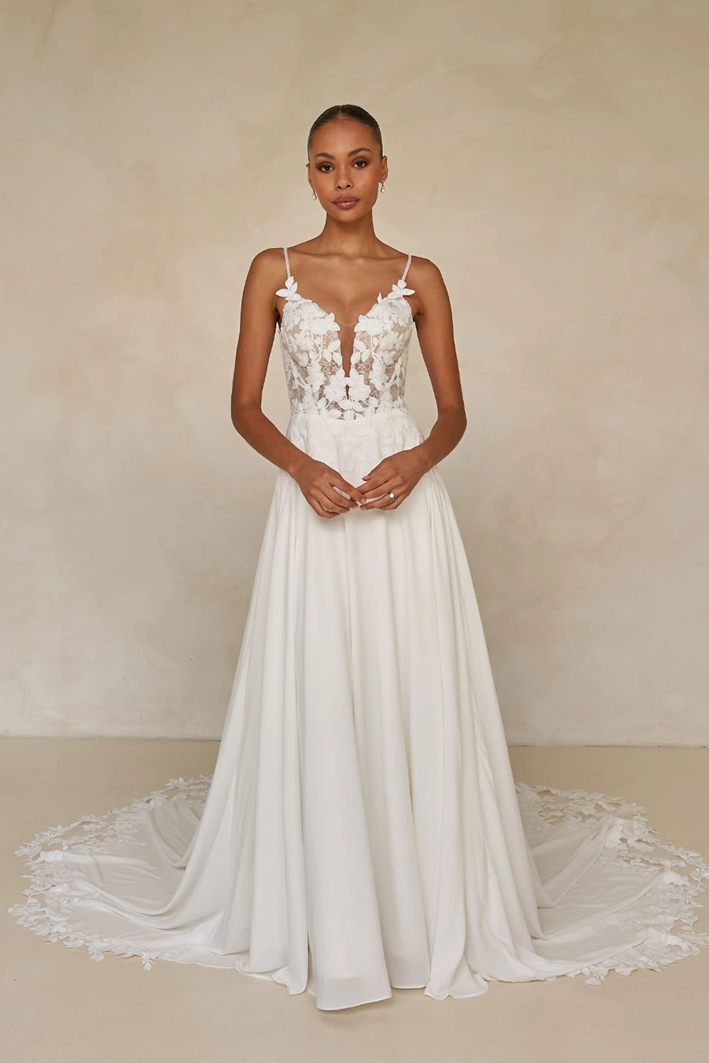 Das Modell Whyte von Madi Lane ist ein zart fließendes A-Linien Brautkleid eine Komposition aus Pailletten-Chantilly-Spitze, matter Stickerei und luftigem Chiffon verleiht Tiefe und Dimension.
