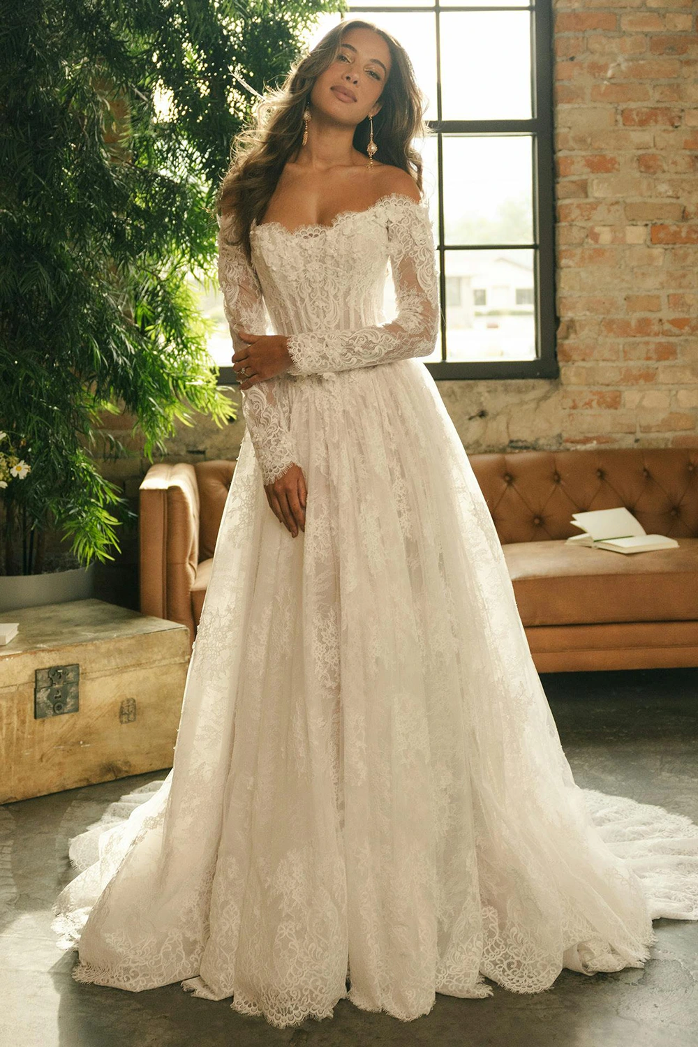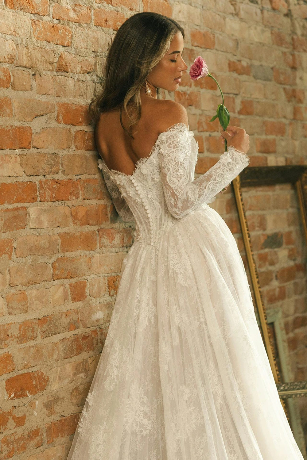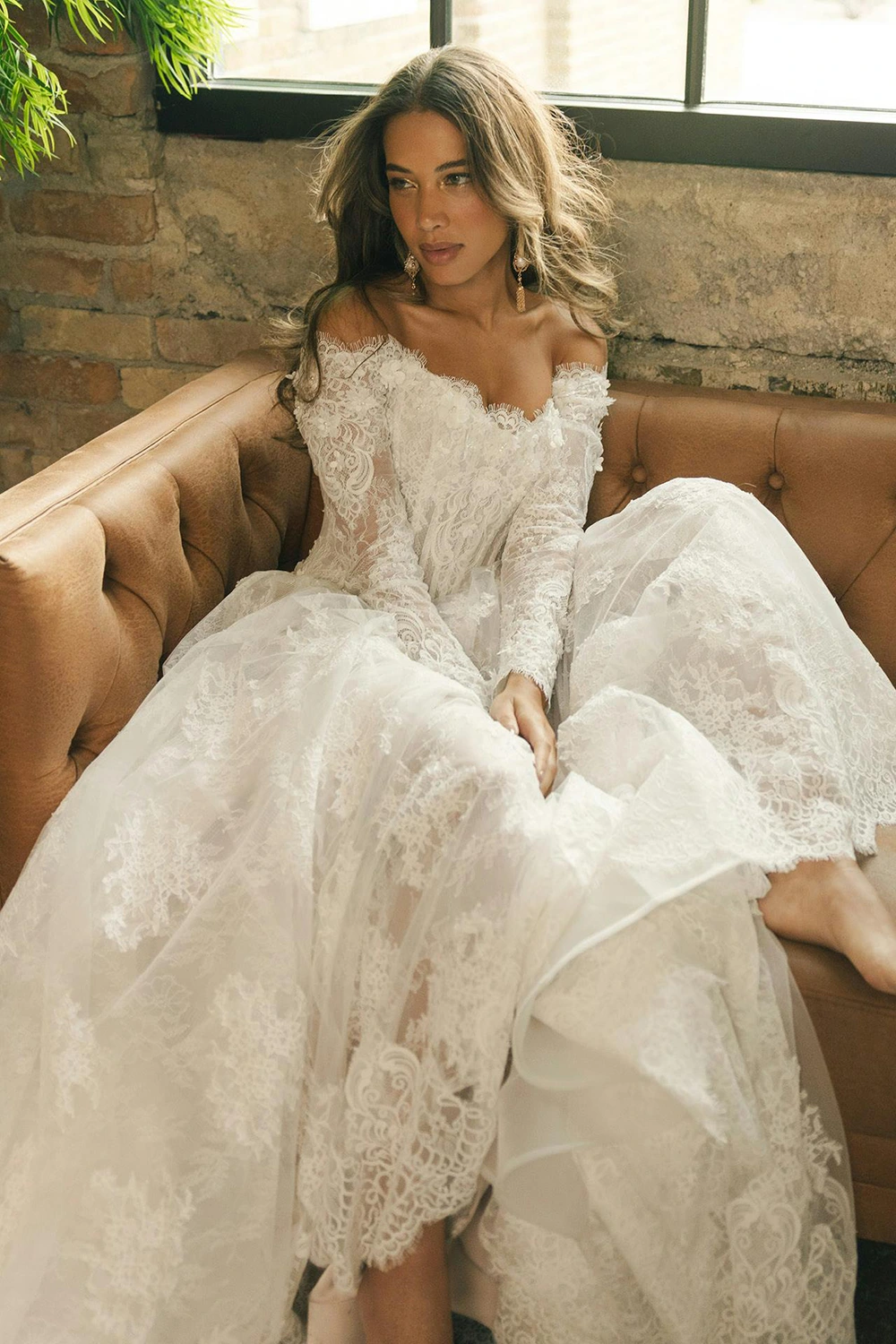 Das Modell Kitaro von Maggie Sottero ist ein fließendes A-Linien Brautkleid aus Chantilly-Spitze.