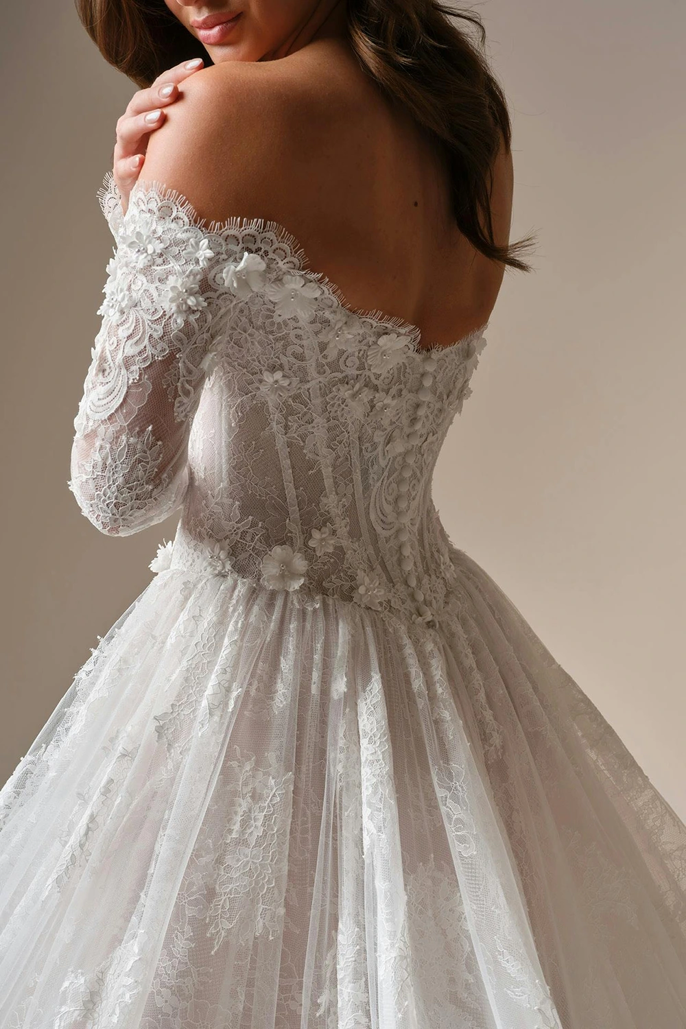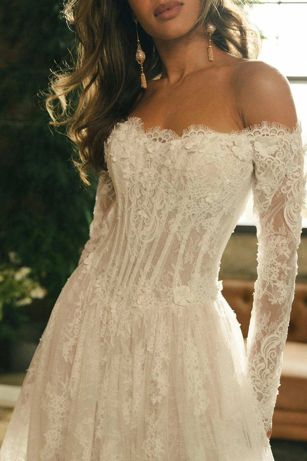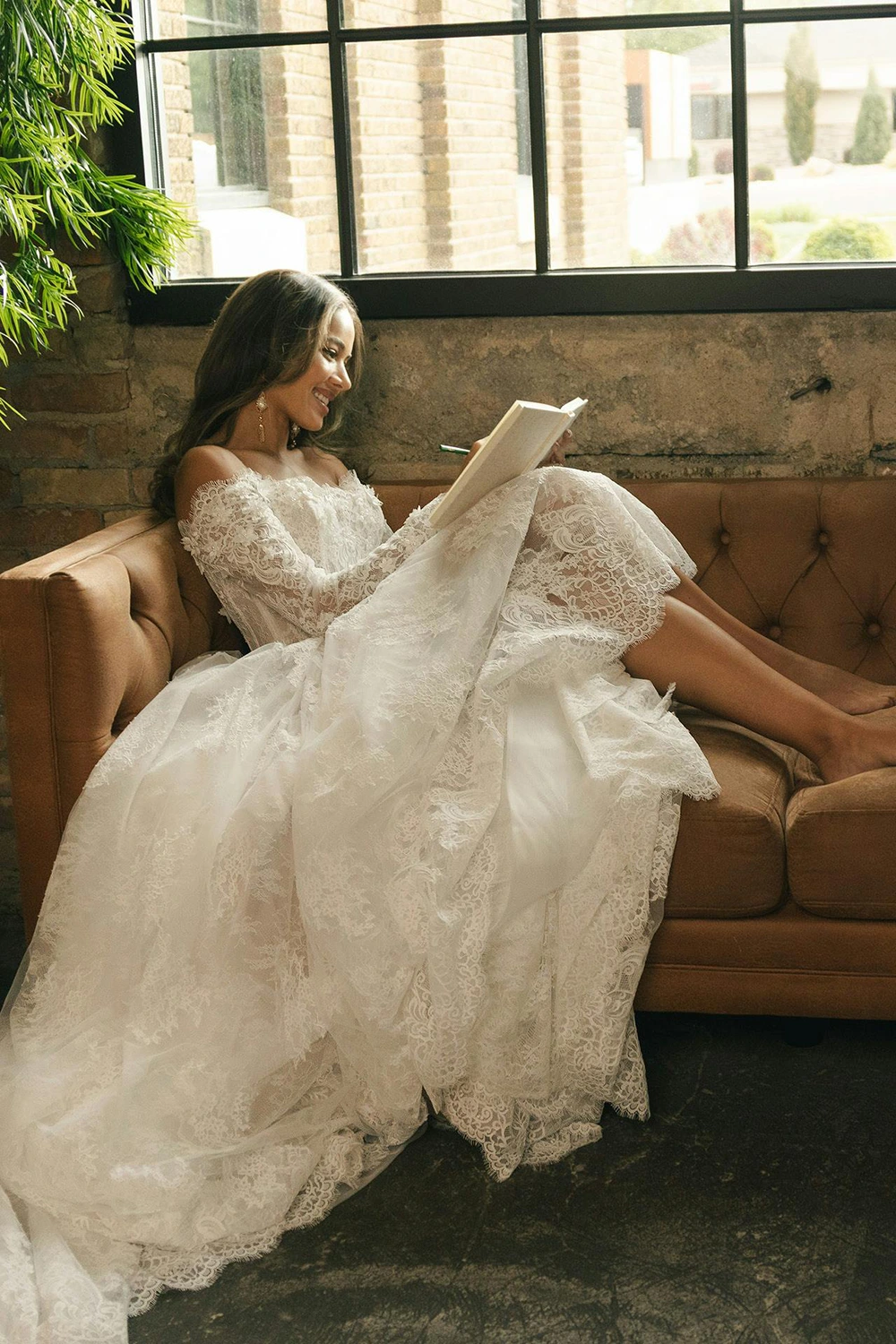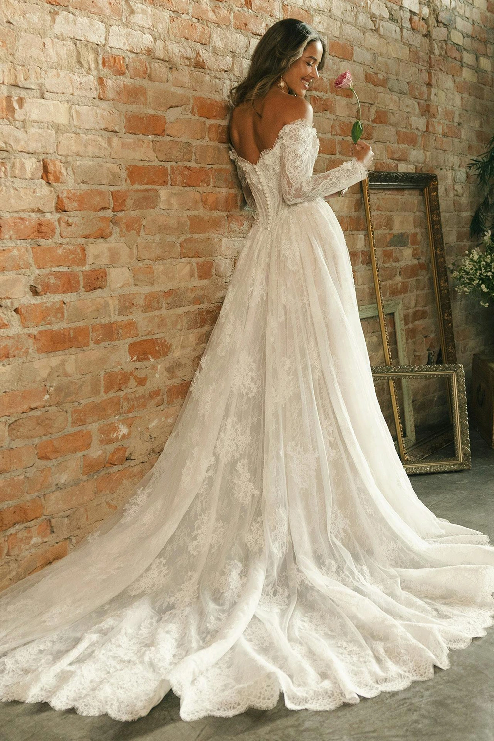 Das Modell Kitaro von Maggie Sottero ist ein fließendes A-Linien Brautkleid aus Chantilly-Spitze.