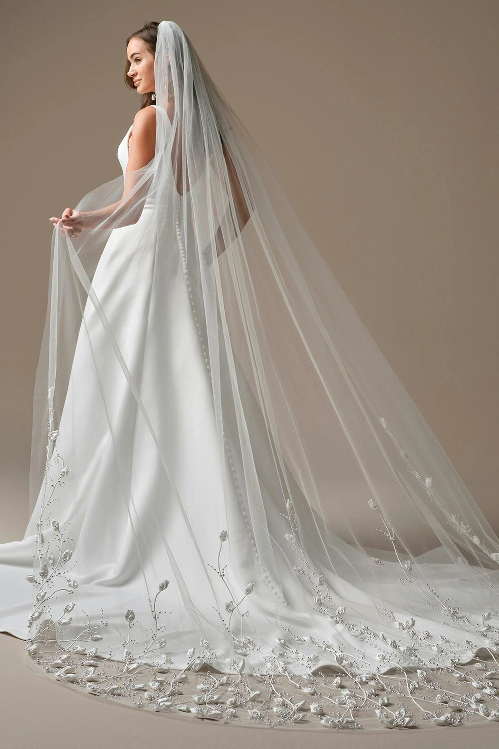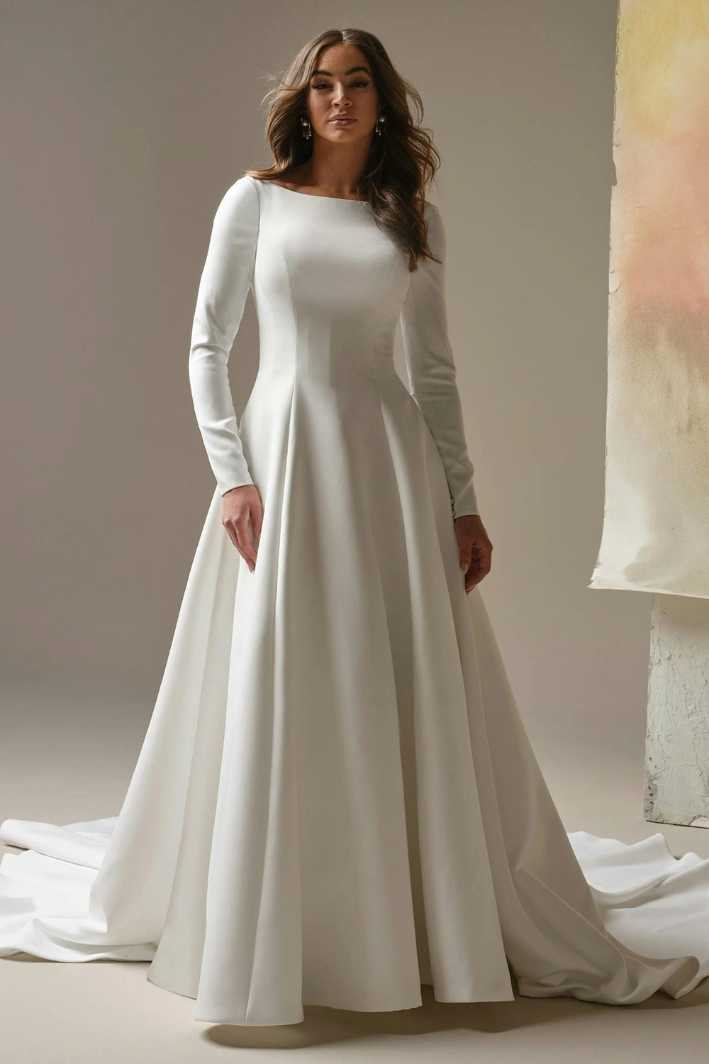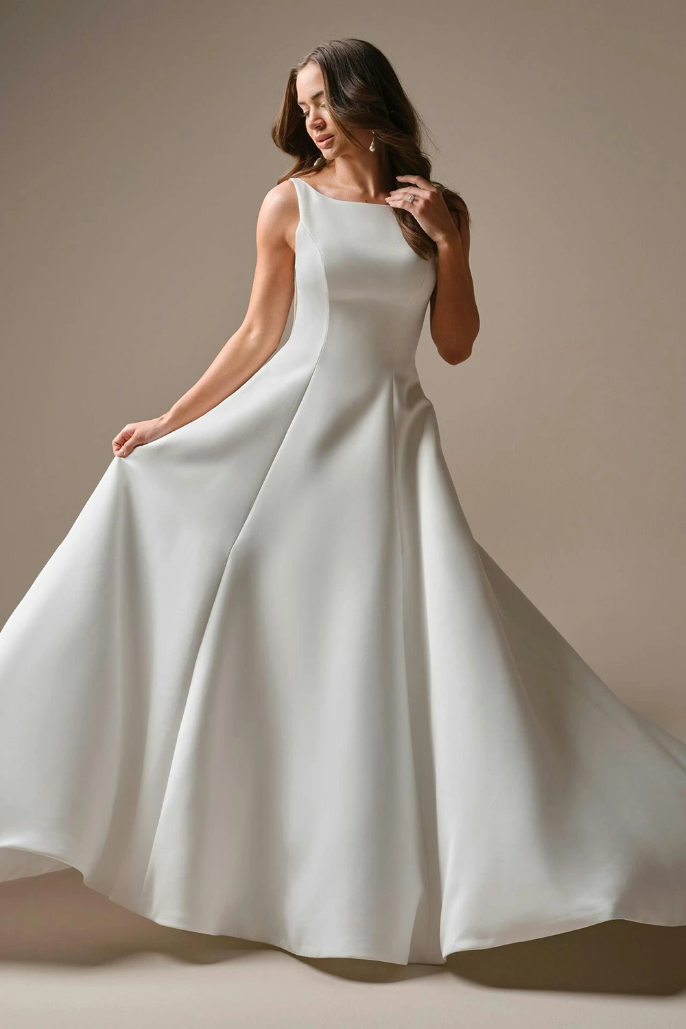 Das Modell Lawrence von Maggie Sottero ist ein cleanes A-Linien Brautkleid mit einem tiefen V Rücken.