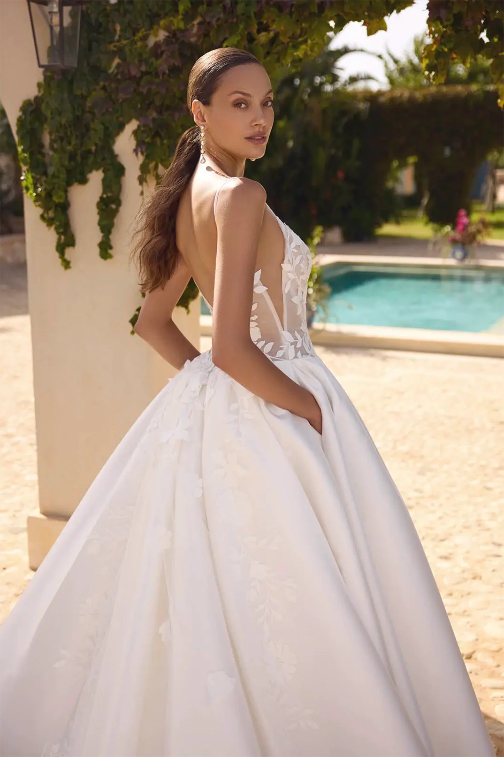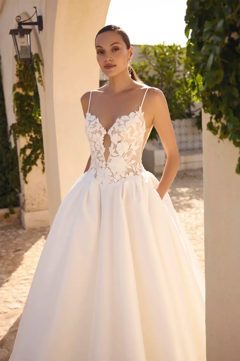 Das Modell Gyda-D von Modeca ist ein romantisches Prinzessinnen Brautkleid mit schlichtem Rock und Spitzenoberteil.