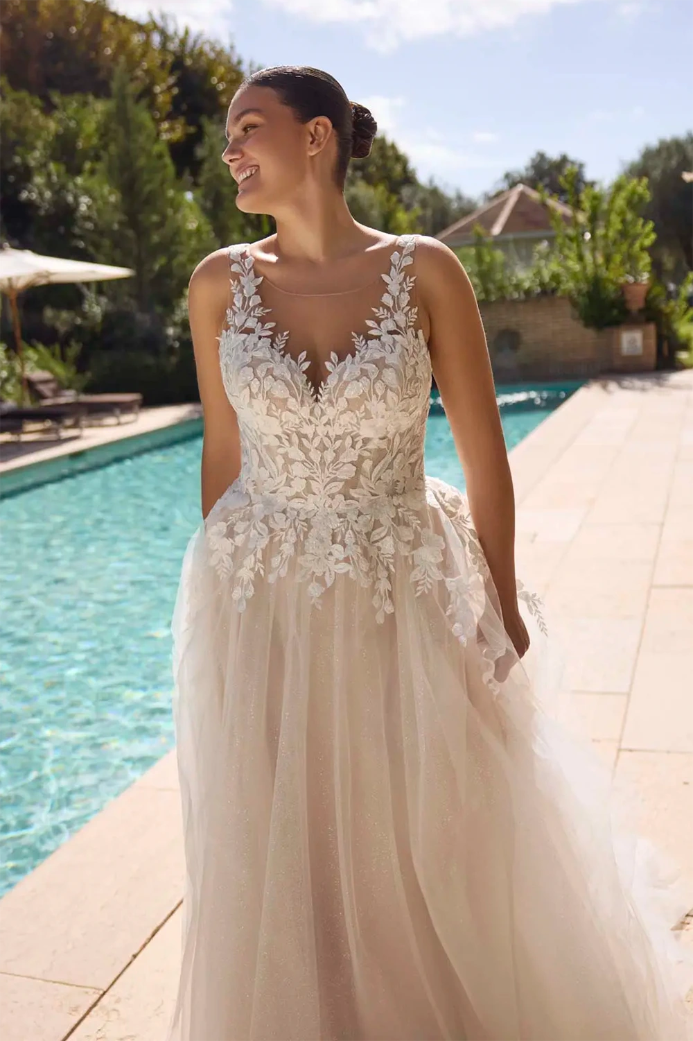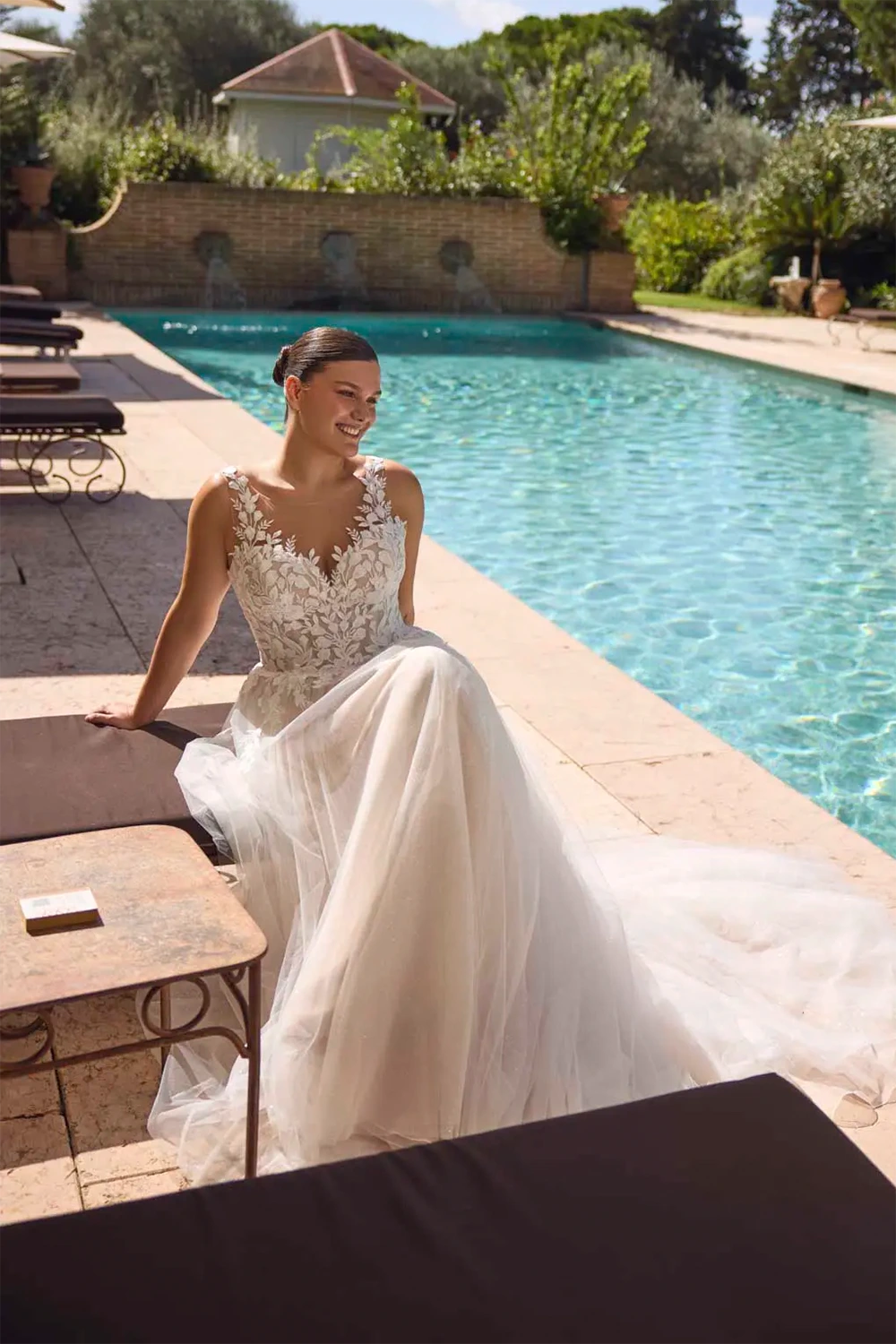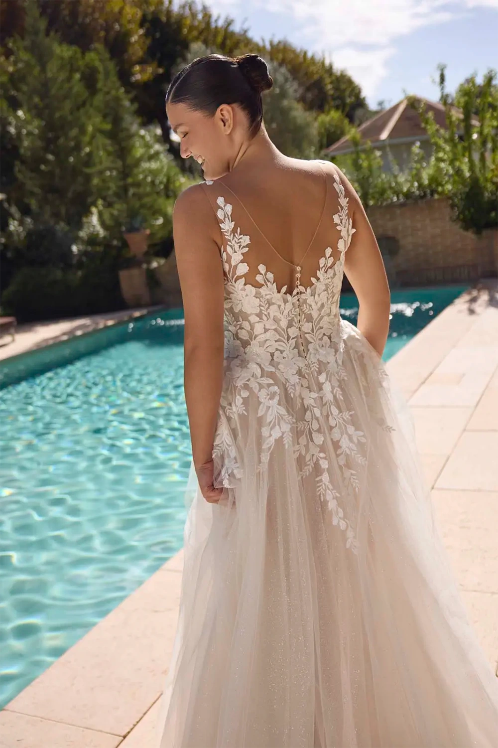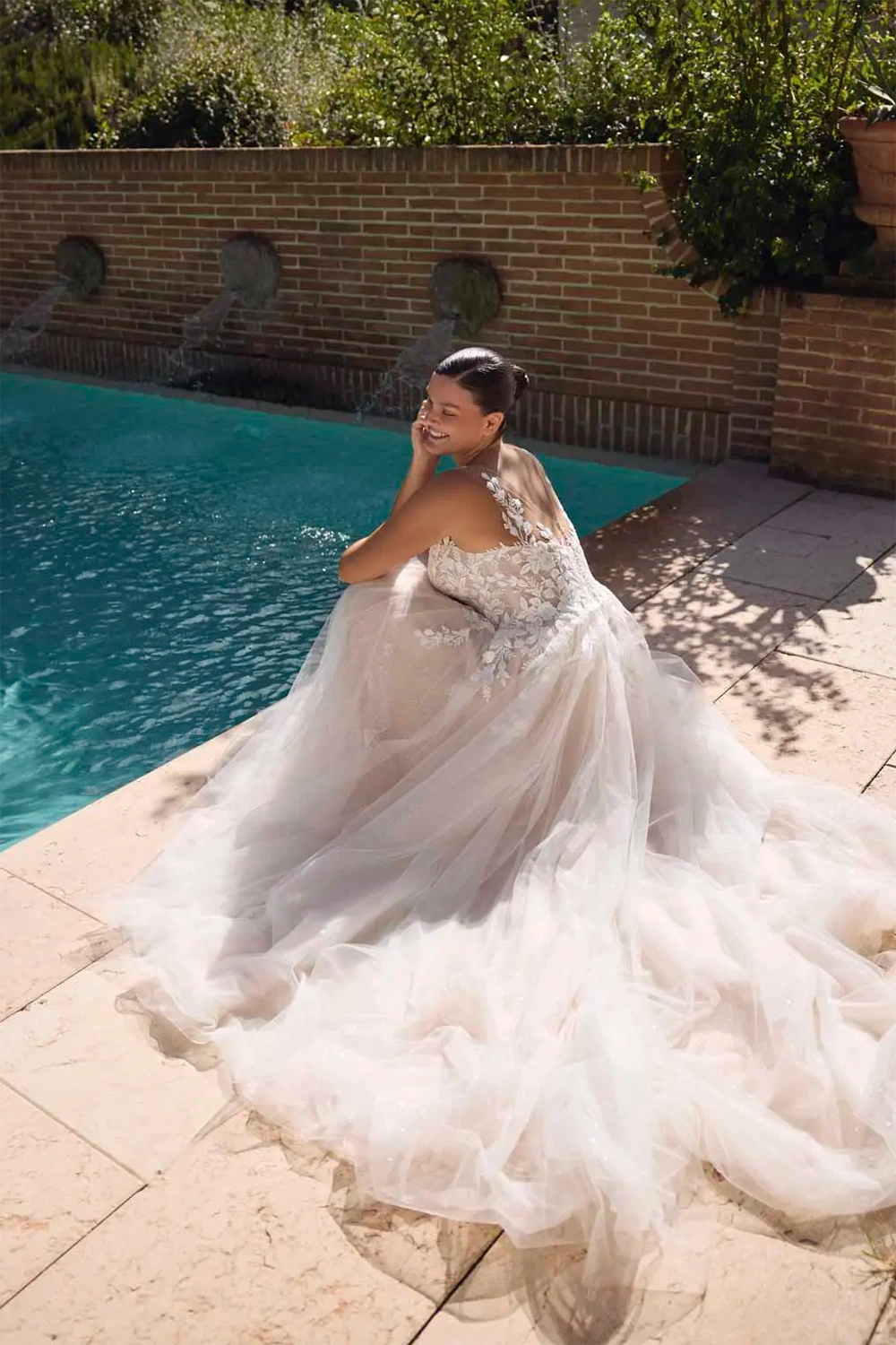 Das Modell Jessie Curvy von Modeca ist ein elegantes A-Linien Brautkleid, das mit zarter Spitze und Tüllrock deine Figur perfekt in Szene setzt.