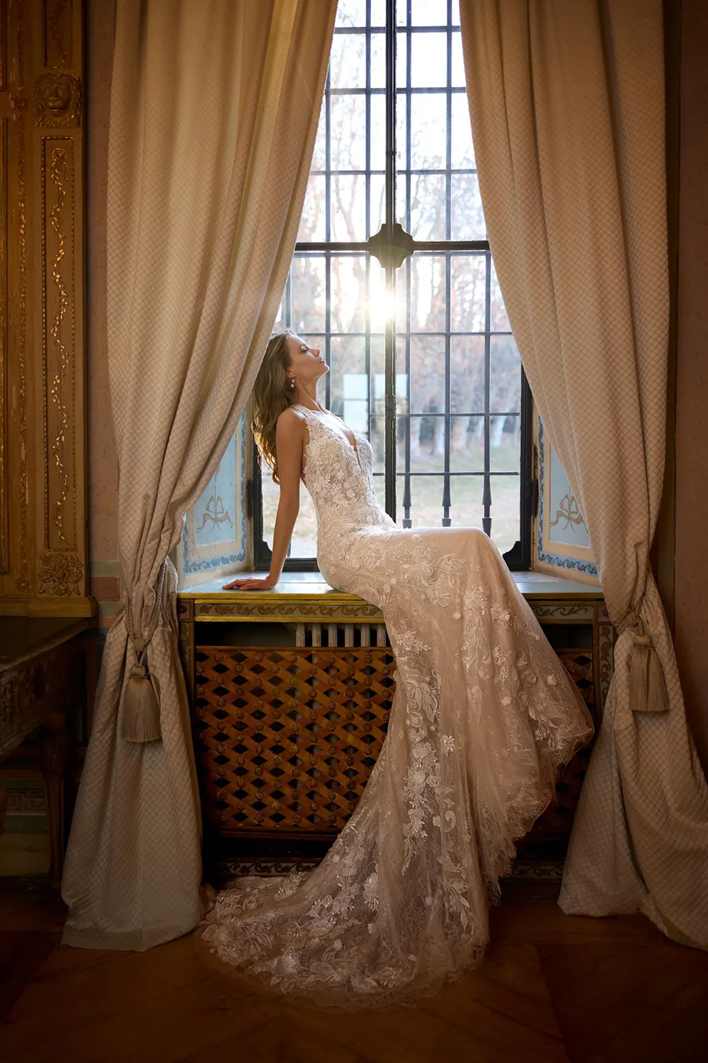 Das Modell Ieasha von Randy Fenoli ist ein romantisches Meerjungfrauen / Fit-and-Flare Brautkleid mit tiefen Rückenausschnitt.