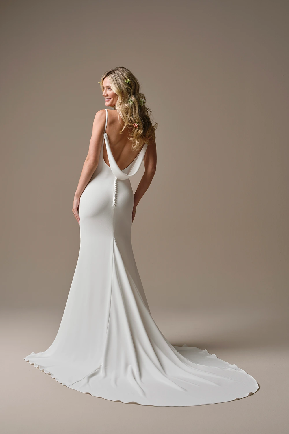 Das Modell Brenda von Rebecca Ingram Bridals ist ein zartes Fit und Flare Brautkleid aus Satin, es bewsticht durch cleane Eleganz .