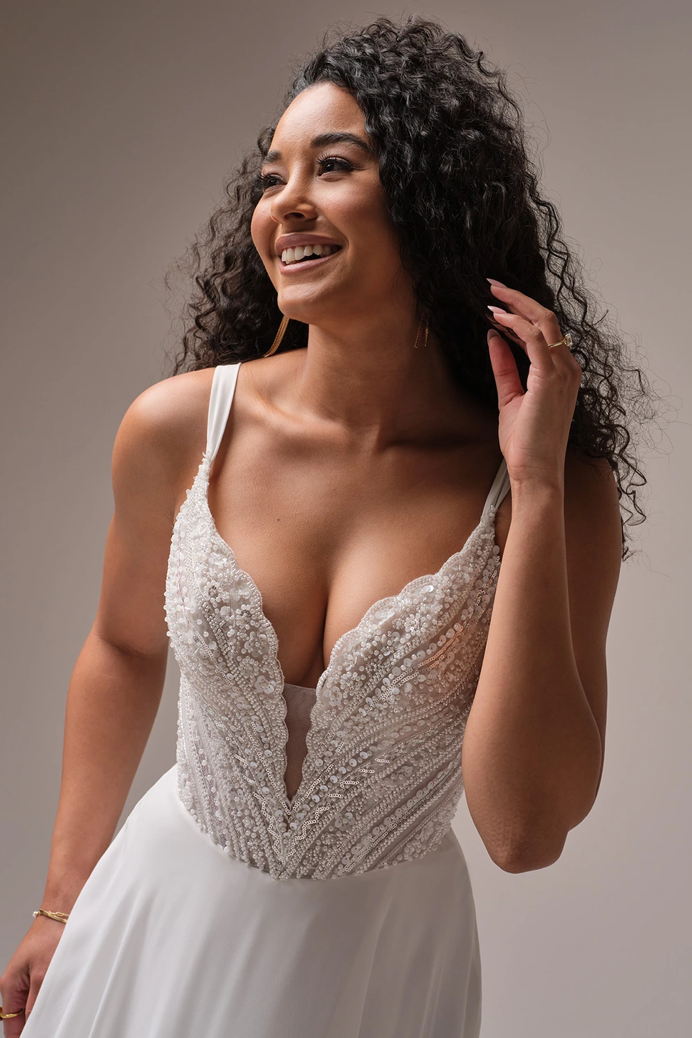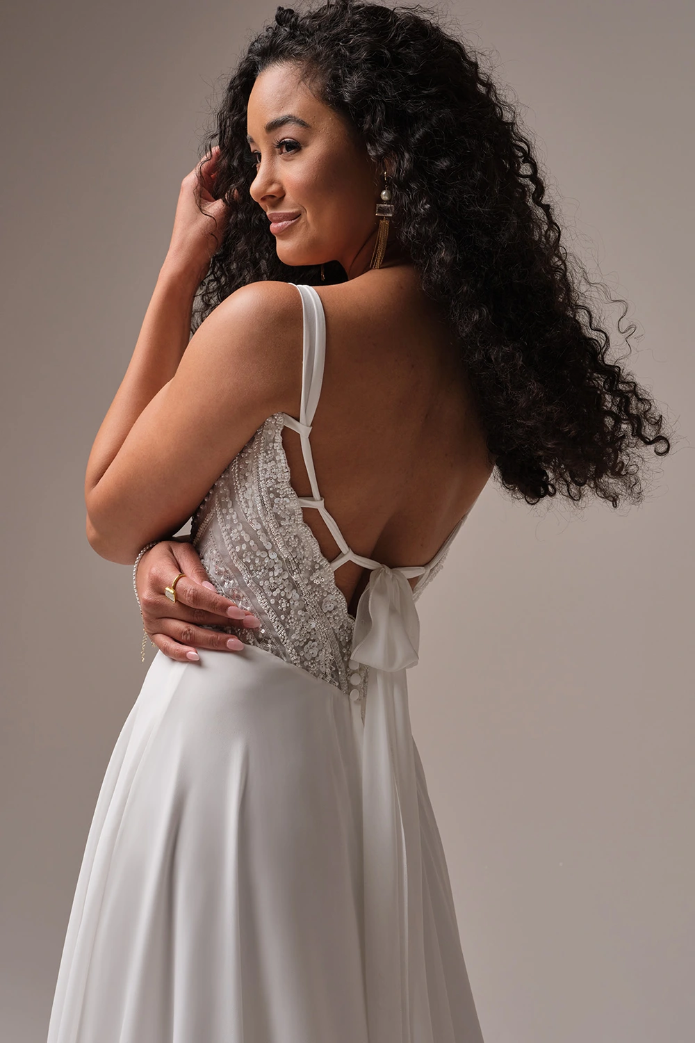 Das Modell Clara von Rebecca Ingram Bridals ist ein zart fließendes Brautkleid mit einem Chiffonrock und einem glamourösen Oberteil aus Strasssteinen und einem geschnürten Rücken.