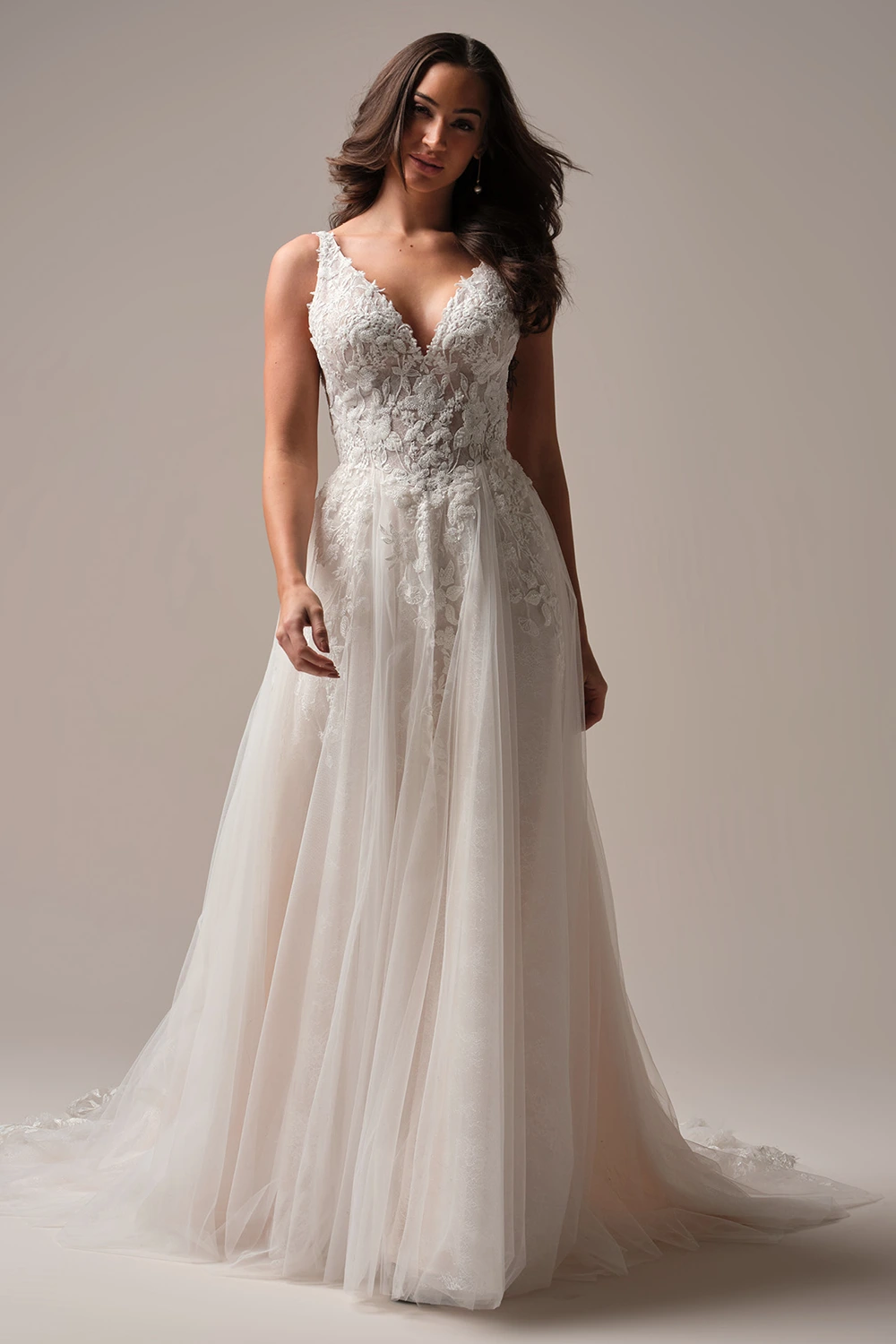 Das Modell Honor von Rebecca Ingram Bridals ist ein klassisches A-Linien Brautkleid mit floralen Blumenapplikationen und einem Tüllrock mit bestickter Schleppe.