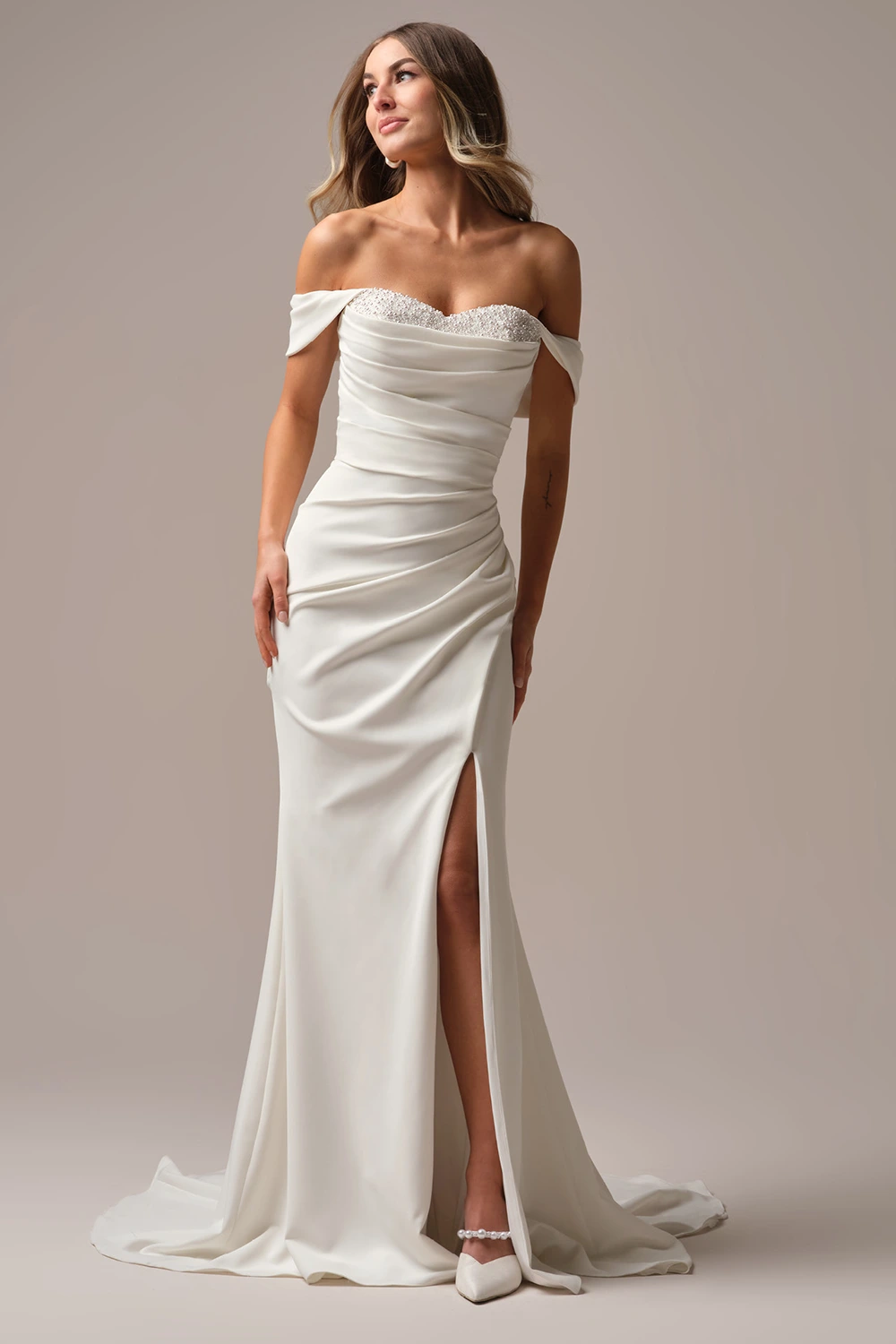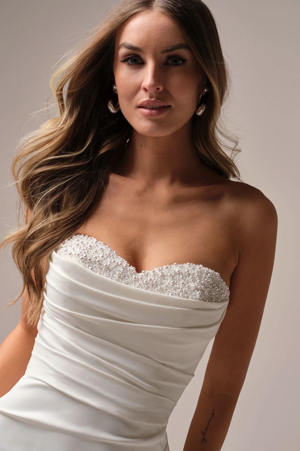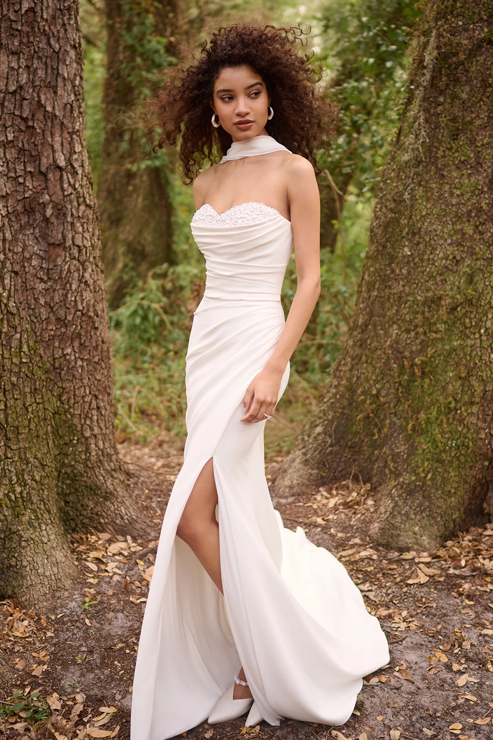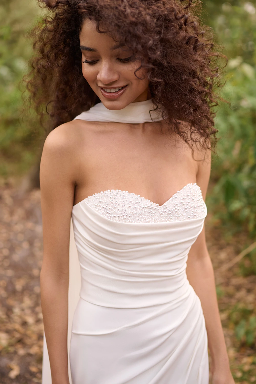 Das Modell Kathleen von Rebecca Ingram Bridals ist ein modernes Fit und Flare Brautkleid welches besonders durch die raffungen im oberen Teil des Kleides besticht. Der zarte Herzausschnitt ist besetzt mit Glitzersteinen.