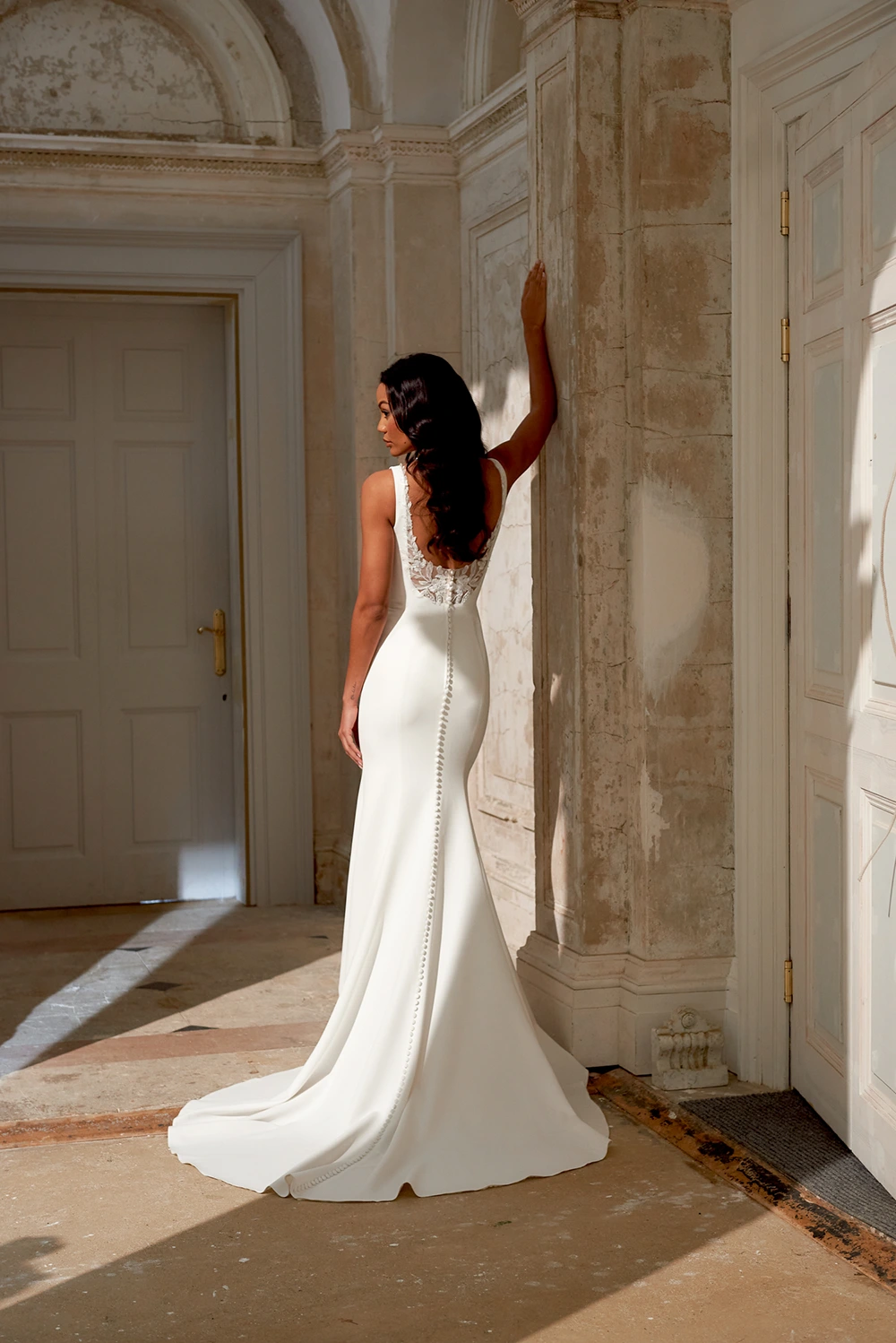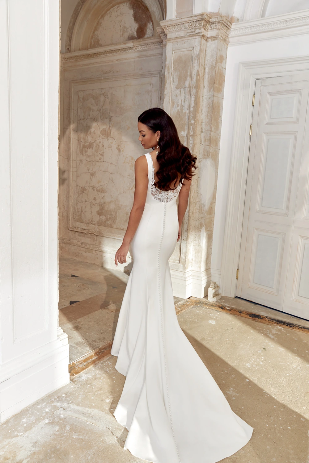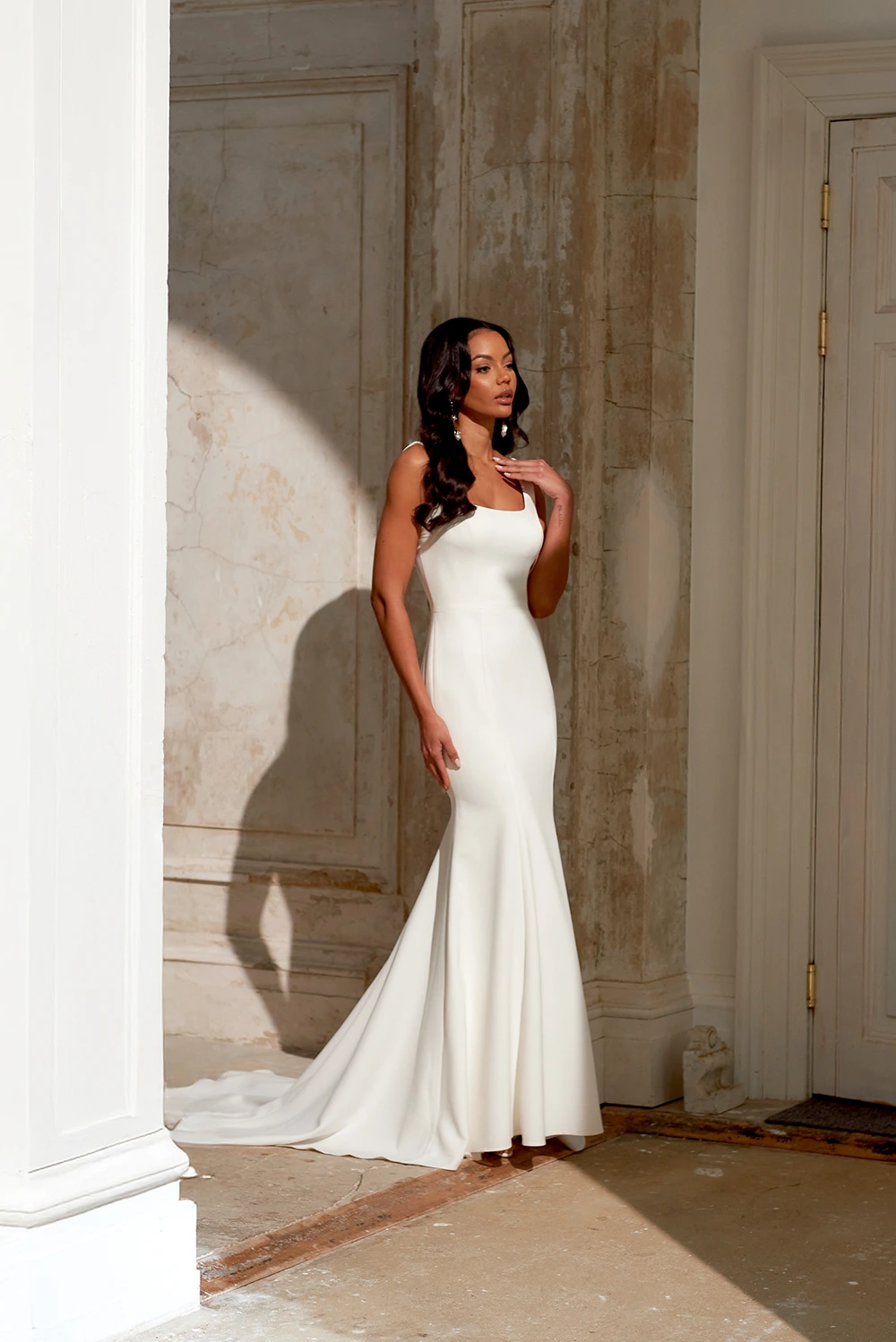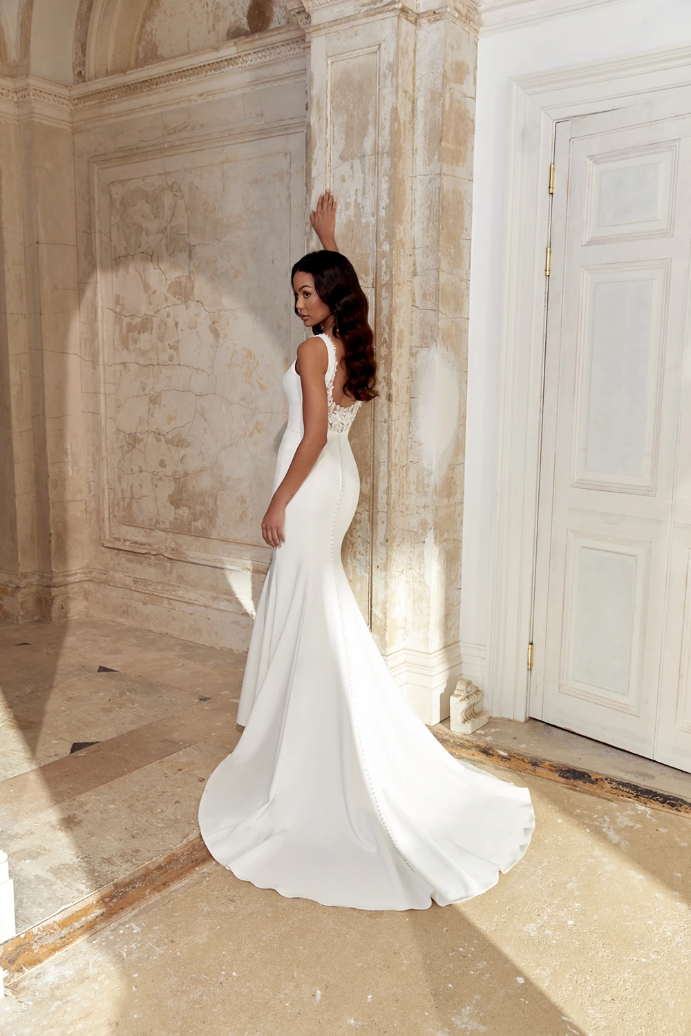 Das Modell 44546 von Sincerity ist ein cleanes Fit und Flare Brautkleid mit breiten Trägern und einem Rücken aus semitransparenter Spitze.