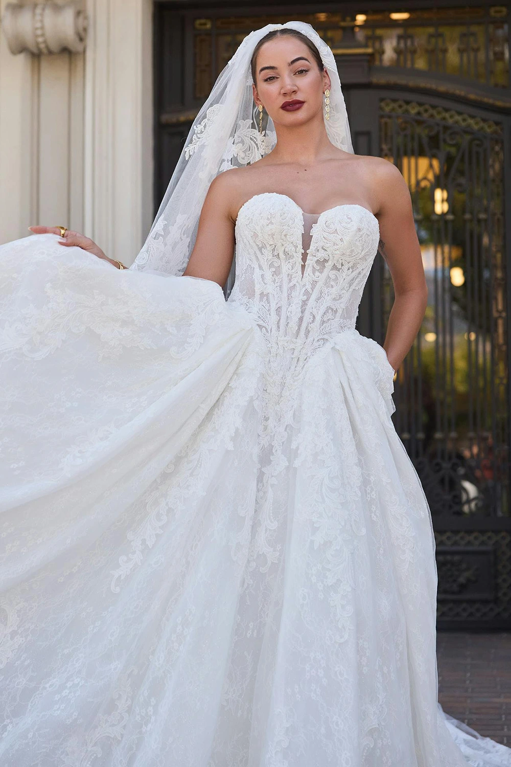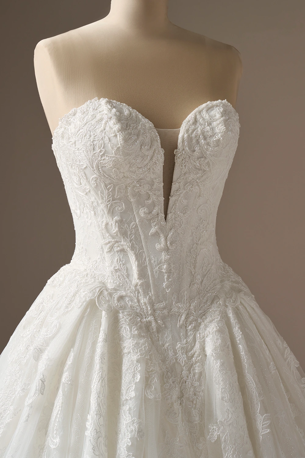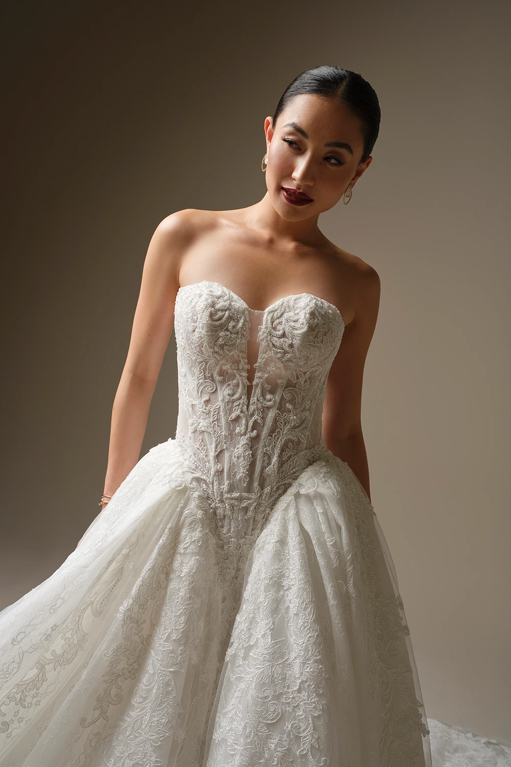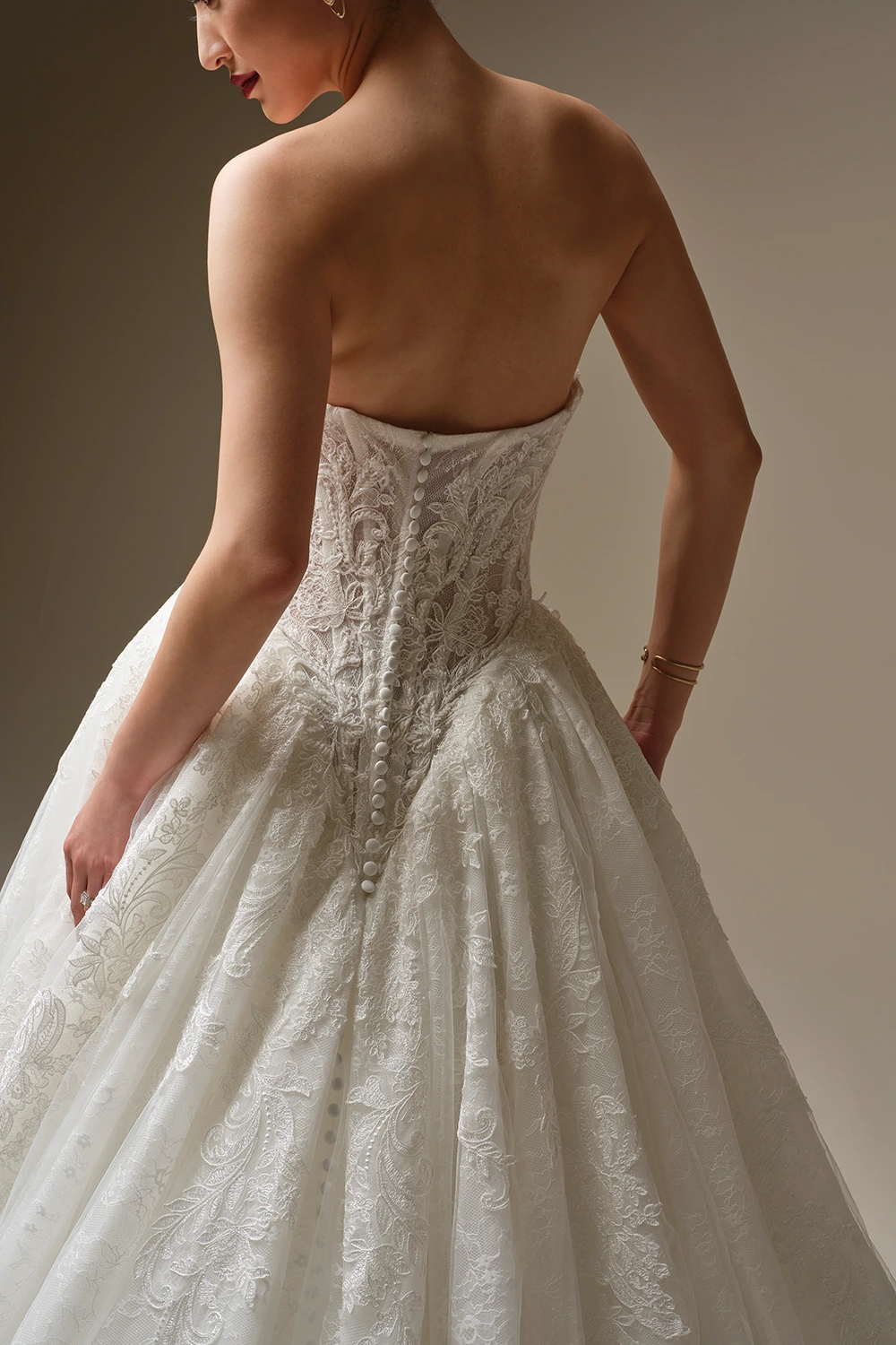 Das Modell Zulani von Sottero und Midgley ist ein trägerloses Prinzessinnen Brautkleid mit perlenbesetzter Spitze, Korsett und verlängertem transparenten Spitzenzug.