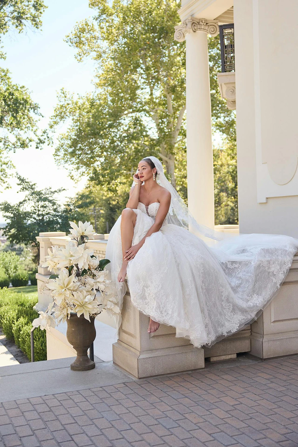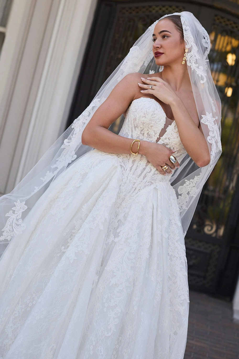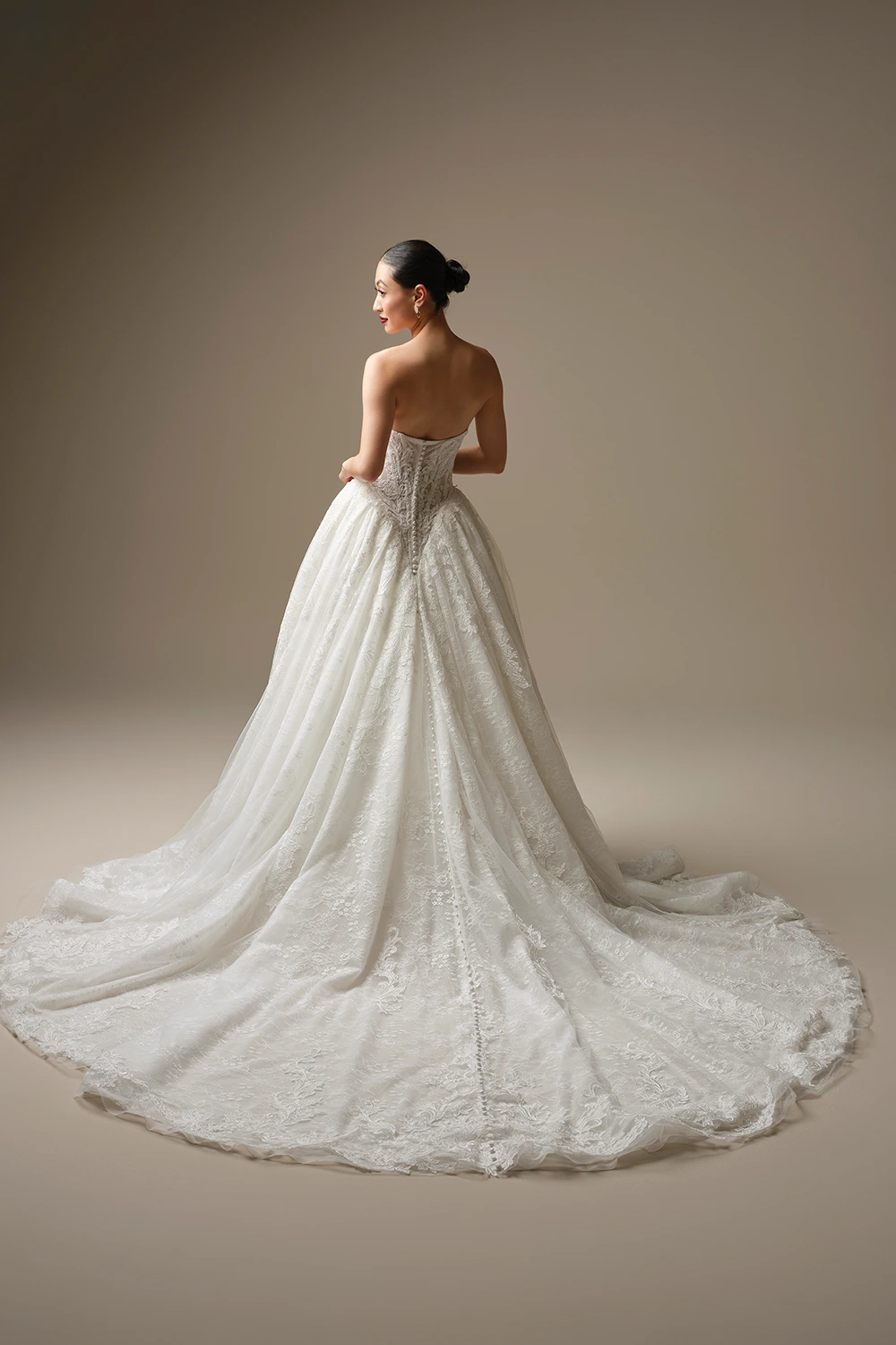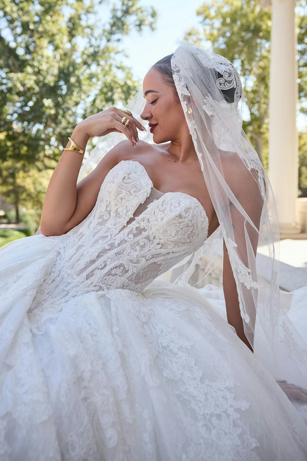 Das Modell Zulani von Sottero und Midgley ist ein trägerloses Prinzessinnen Brautkleid mit perlenbesetzter Spitze, Korsett und verlängertem transparenten Spitzenzug.