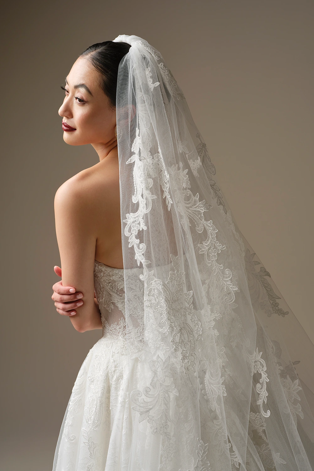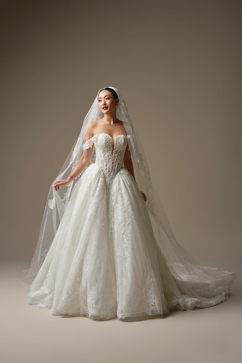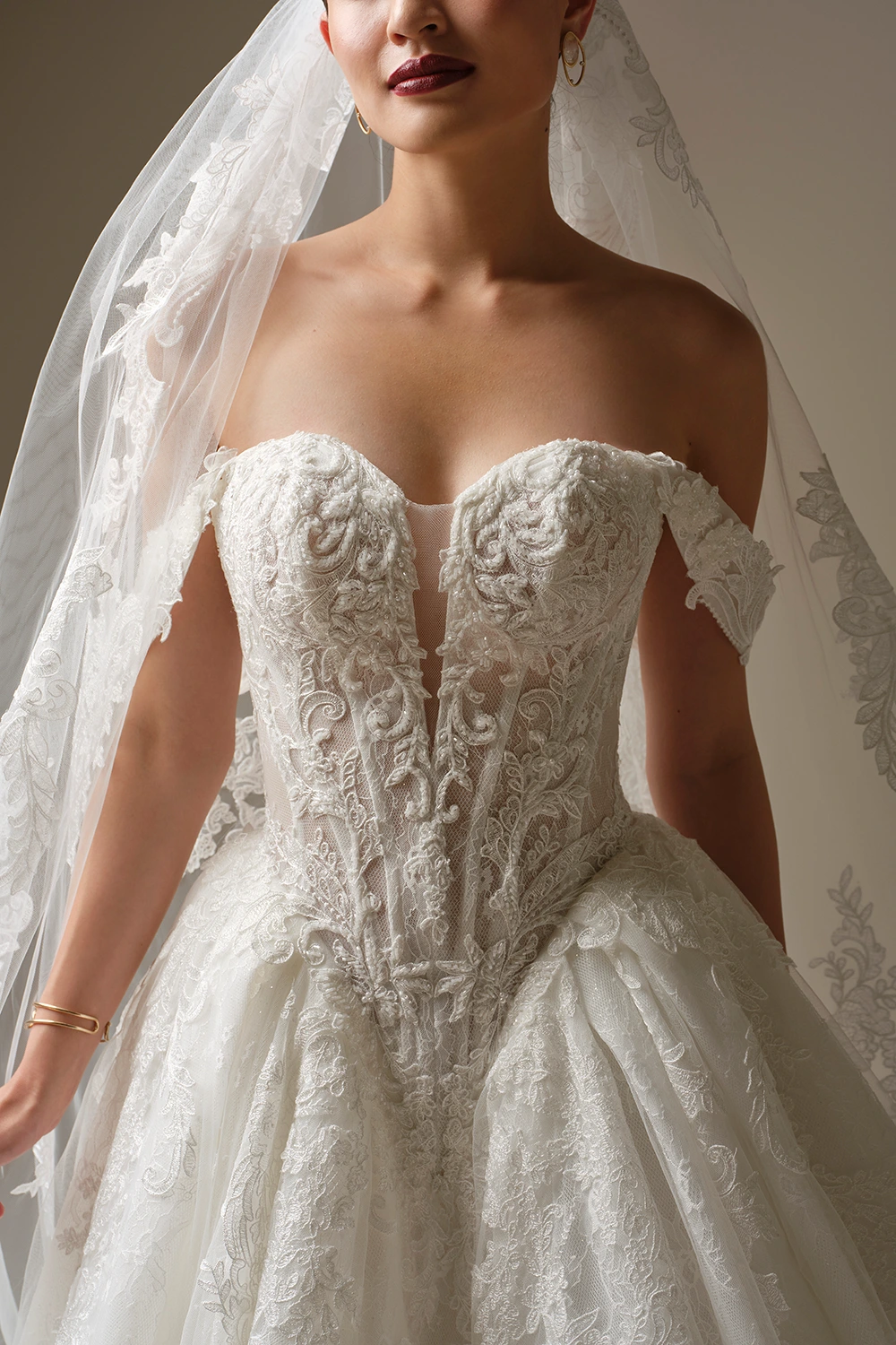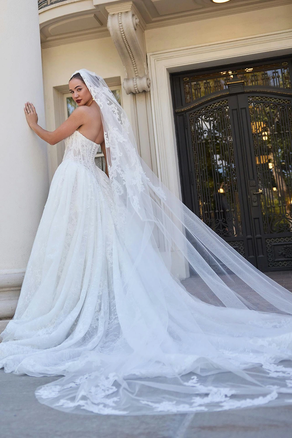 Das Modell Zulani von Sottero und Midgley ist ein trägerloses Prinzessinnen Brautkleid mit perlenbesetzter Spitze, Korsett und verlängertem transparenten Spitzenzug.