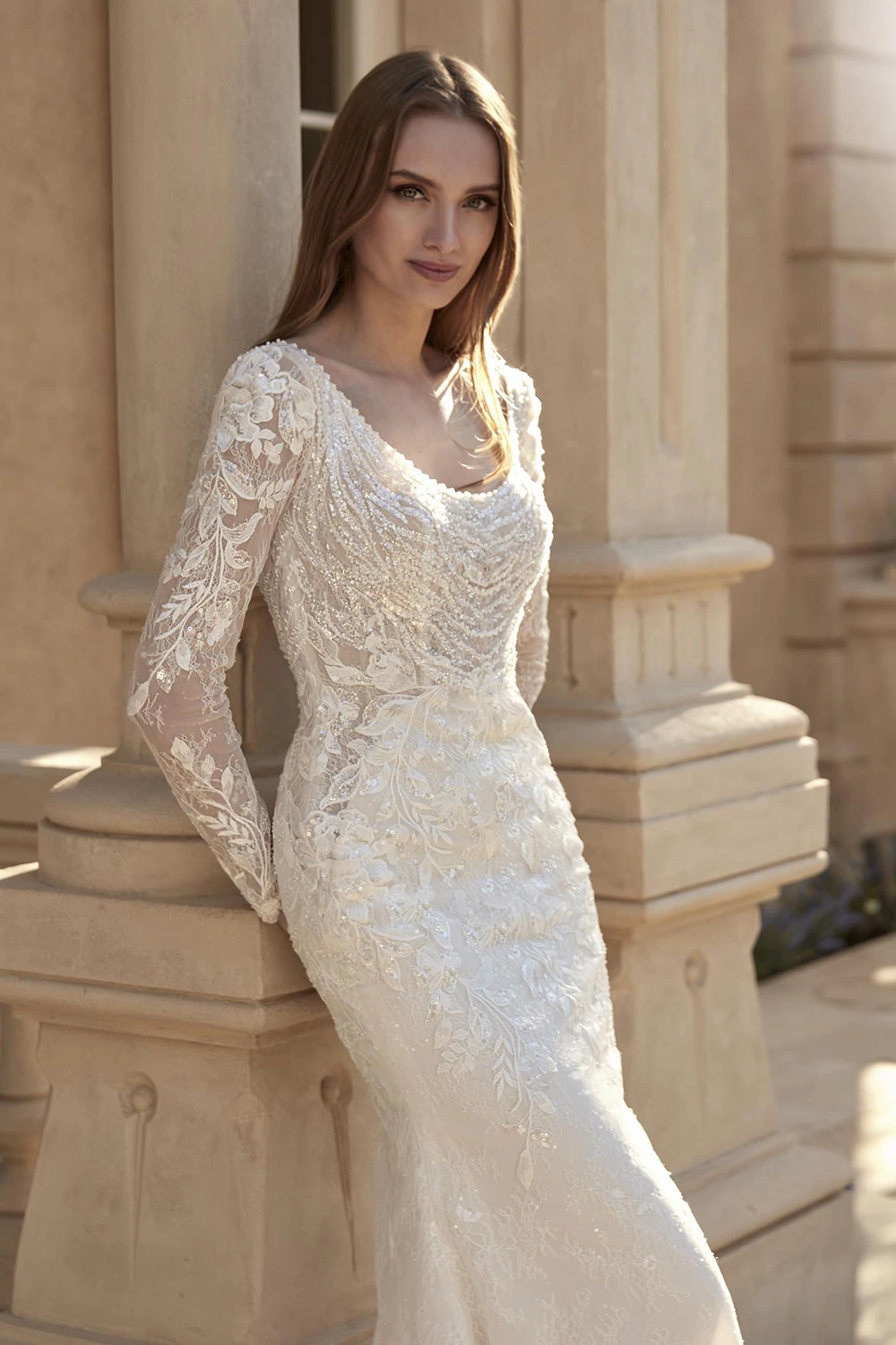 Das Modell Dixi von St. Patrick ist ein modernes Fit und Flare Brautkleid aus floraler Spitze und Glitzer. Die langen Ärmel und der tiefe Rückenausschnitt sind hier ein besonderes Highlight.