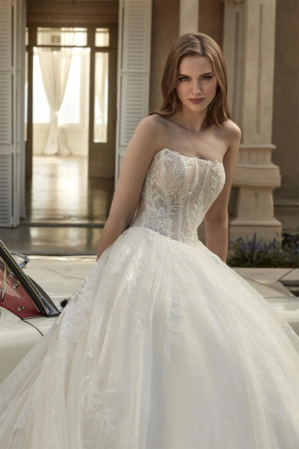 Das Modell Salima von St. Patrick ist ein modernes Prinzessinnen Brautkleid mit einer semitransparenten, trägerlosen Corsage.