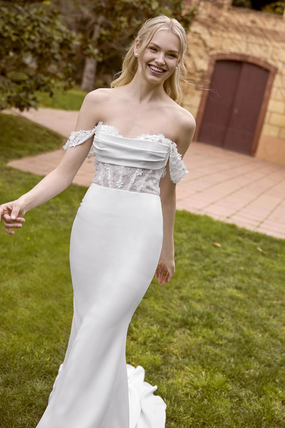 Das Modell Fenny von White One ist ein cleanes Fit und Flare Brautkleid mit floralen Highlights und Carmenträgern .