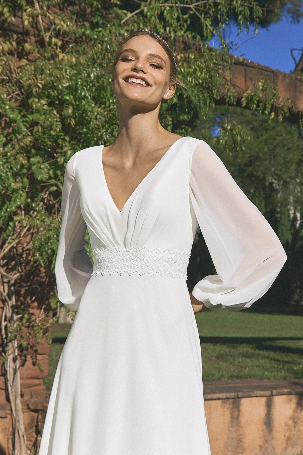 Das Modell Gaetano von White One ist ein leichtes chiffon Brautkleid mit langen Ärmeln und einer betonten Taille.